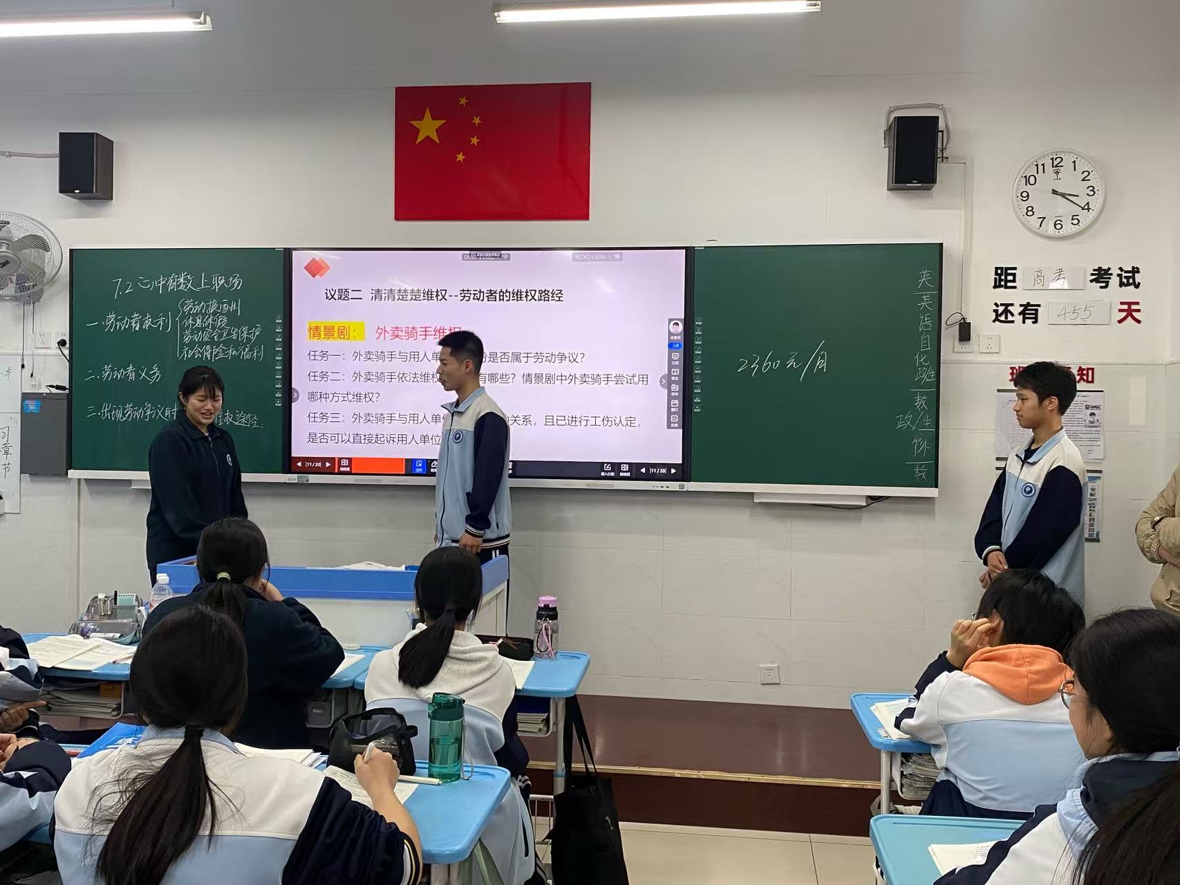 课堂上,刘登老师紧扣新课标理念,立足法治教育与思政育人要求,以贴近学生生活的案例为切入点,创新采用情景剧形式导入新课,形式新颖、生动有趣,迅速激发学生学习兴趣,有效激活课堂氛围。课堂教学聚焦劳动者的权利与义务、劳动争议的解决途径等核心内容,将法律知识与生活实践紧密结合,教学设计严谨、逻辑清晰、互动充分,层层递进突破教学重难点,切实培育学生法治意识与法治素养,充分展现了骨干教师扎实的教学功底与成熟的课堂驾驭能力。
