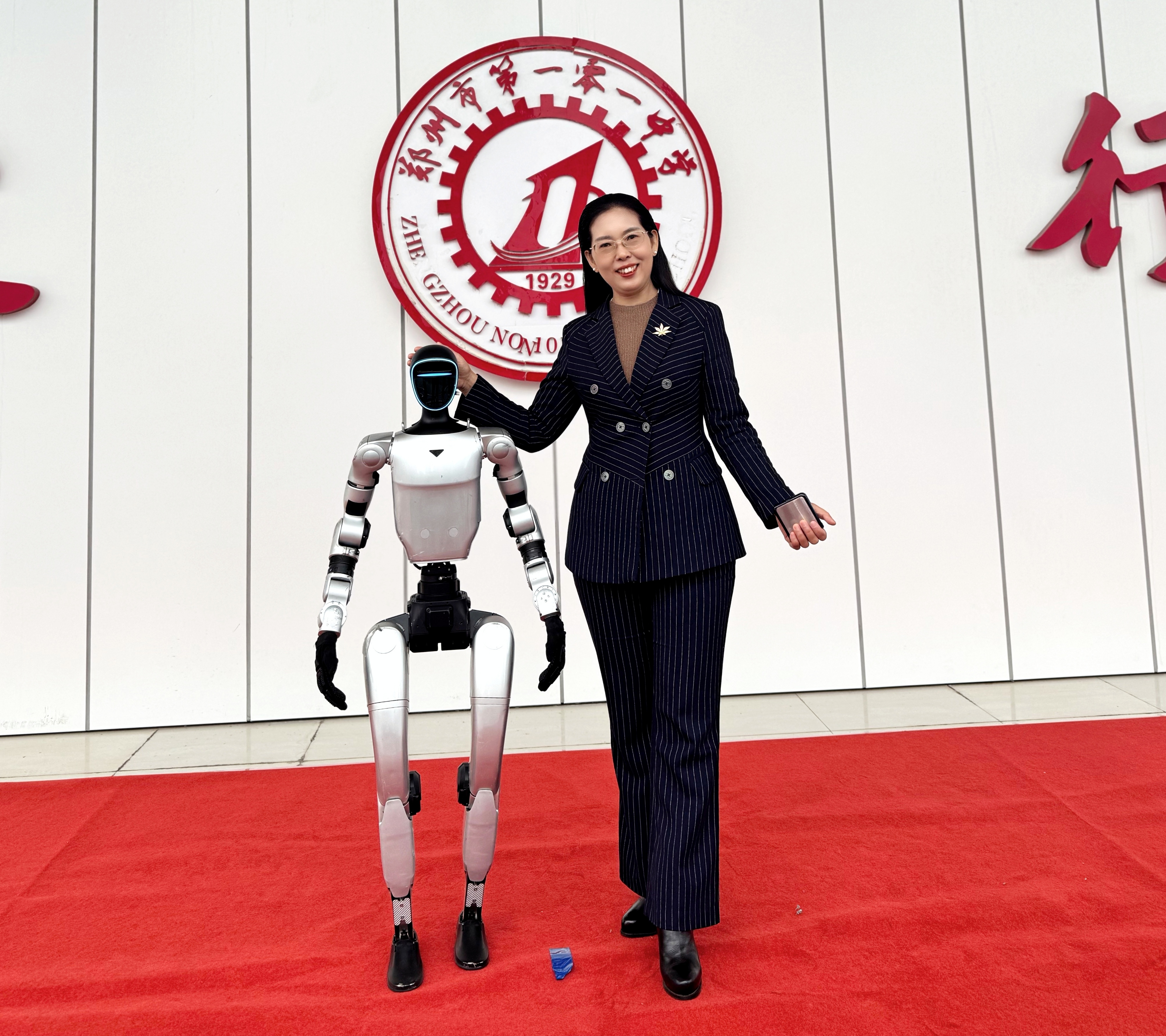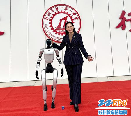 第29届科学艺术节开幕式上郑州市第一〇一中学校长谭纪萍与具身机器人合影