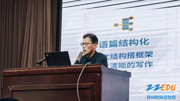 随后,活动进入专题汇报环节,郑州市第四十七高级中学李志合老师以《立足课本 以写赋能——高中英语写作关键能力培养路径》为主题,以 “回归课本,以本为本” 为核心理念,界定四大写作关键能力,针对教学痛点提出五大核心实施路径,让教材成为学生写作最佳范本,并分享主题群文阅读、年级差异教学等可落地建议。