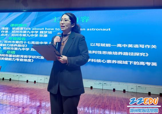 课例展示后,郑州市第九中学张康老师进行专业评课,高度肯定本节课的教学设计与实施效果,提炼出三大教学亮点。她表示,本节课以真实校园活动导入,让语言学习贴近现实;巧用听说结合策略,实现学生听辨与口语表达能力同步提升;活动设计贴合教学目标,模拟实践极具实操性,且评价环节完整闭环。