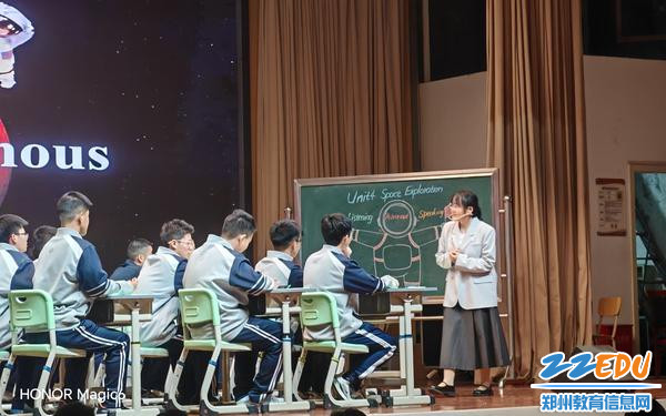 活动首个环节为课例展示,郑州市第九中学魏梦旭老师带来必修三第四单元Space Exploration听说课。课堂上,魏梦旭老师以学校近期航天主题活动为真实情境导入,紧扣 “如何成为一名宇航员” 核心话题,将航天文化与英语听说教学深度融合,设计面试官与面试者模拟实践活动。通过任务驱动、情境对话、小组互动等方式,引导学生沉浸式参与听辨与表达,在提升听说综合运用能力的同时,带领学生探索航天精神内涵,实现语言能力培养与德育渗透的有机结合。