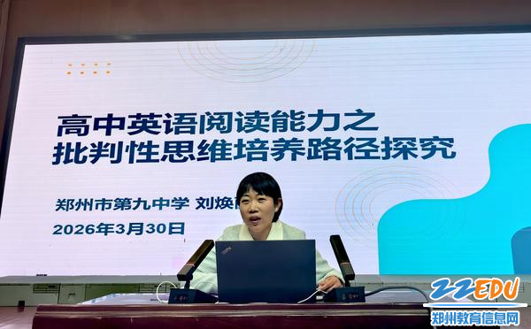 郑州市第九中学教师刘焕丽以《高中英语阅读能力之批判性思维培养路径探究》为主题,紧扣新课标要求,将批判性思维定位为阅读高阶能力核心,剖析教学现存问题,提出高中三年一体化、分层递进式培养策略,分享问题链驱动、读思写一体化等实践方法,为阅读教学中思维品质培养明晰路径。