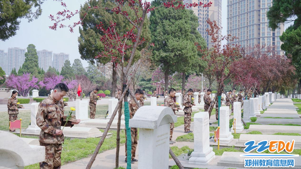 下午,郑州市国防科技学校40余名团员志愿者前往烈士墓区集体扫墓,为结对认亲的无名英烈敬献鲜花、擦拭墓碑。