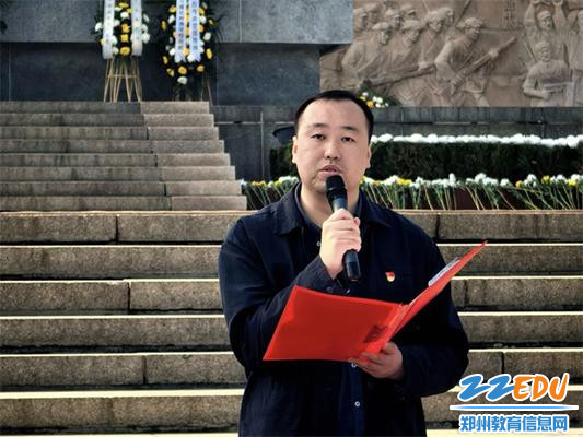 随后,郑州市第四初级中学党总支副书记都煜在现场为师生讲授了一堂生动的思政课。他深情讲述了杨靖宇、吉鸿昌、黄继光、邱少云等革命先辈为争取民族独立和人民解放不畏牺牲、英勇斗争的感人事迹,讲述了新时代卫国戍边英雄王焯冉、肖思远誓死捍卫国土的凛然壮举,也回顾了钱学森、黄旭华等杰出科学家为铸就大国重器呕心沥血、无私奉献的奋斗人生。他勉励全体党员教师坚持立德树人根本宗旨,恪尽职守,为党育人、为国育才;激励广大学子继承先烈遗志,紧跟党的步伐,将个人理想融入国家发展伟业,肩负起民族复兴的历史重任。