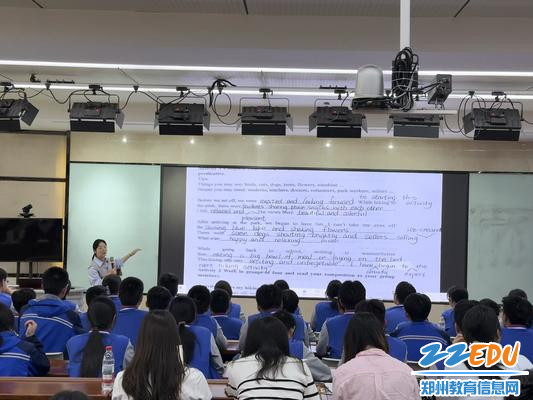 活动中,郑州市第一〇一中学李文飞老师展示《必修三Unit1》示范课,以“用-ing形式描述节日活动”为目标,从学生分享假期体验热身,逐步引导观察归纳,结合春季节日设计练习,将语法学习融入文化语境,帮助学生掌握-ing形式作定语、表语的用法,实现从理解到表达的能力迁移,践行“结构为意义服务”的教学理念。