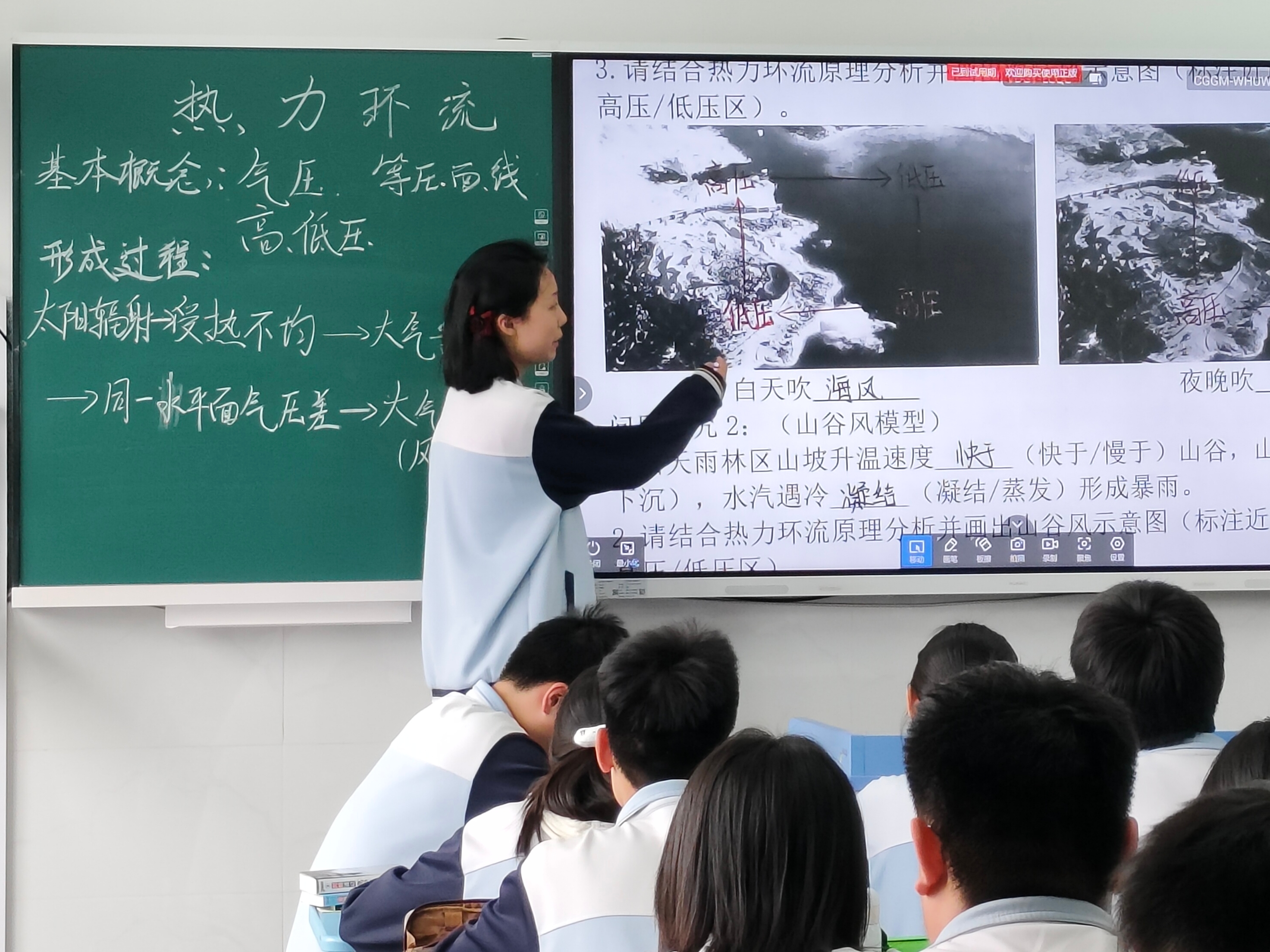 课堂伊始,李振江以“动物城气候危机”AI动画趣味导入,围绕城市气候差异展开探究,顺势引出热力环流核心原理,生动鲜活的情境迅速吸引学生注意力,课堂氛围轻松浓厚。授课中,教师层层梳理知识脉络,拆解大气运动逻辑,结合趣味实验视频直观演示冷热环流现象,化抽象为具象。学生专注投入、积极思考,以小组合作的形式绘图探究、互动交流,主动上台展示分享,学习热情高涨。针对知识难点与易错问题,李振江精准点拨方法技巧,夯实地理读图能力。课堂以“化解动物城气流难题”为任务驱动,融合城市热岛、山谷风等现实案例,引导学生学以致用、合作探究,立足生活实际思考生态优化举措,整堂课互动高效、思维活跃,在沉浸式探究中落实地理核心素养,尽显优质课堂魅力。