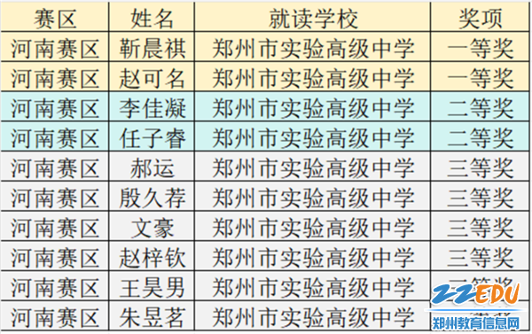 郑州市实验高中学子获奖名单
