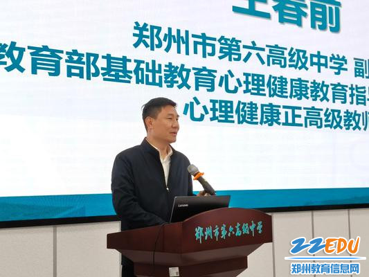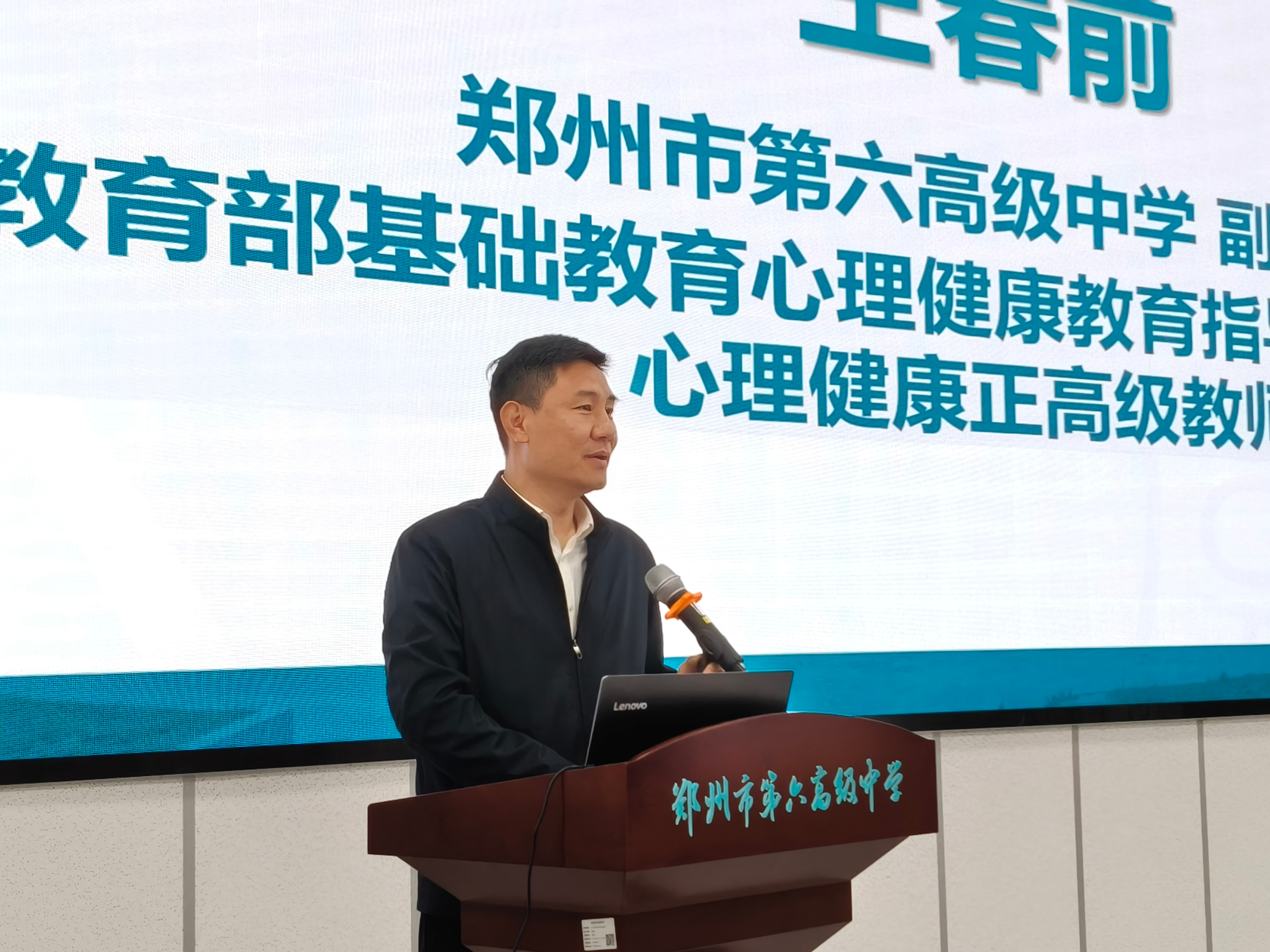 会议伊始,郑州市第六高级中学副校长王春前致欢迎辞。他对参会教师的到来表示热烈欢迎,并介绍了郑州市第六高级中学的发展历程与办学特色。他强调心理健康教育与学科教学融合是落实全员育人的关键举措,期待未来各校在联合教研共同体中携手共进,共同推动区域心理健康教育工作提质增效。