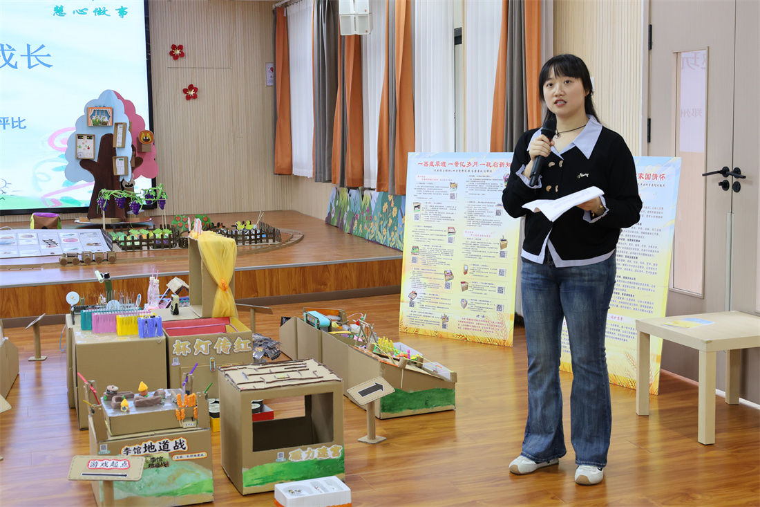 活动现场,参赛教师按抽签顺序依次上台,介绍作品设计意图与游戏规则。老师们集思广益,作品的呈现各有不同,在展示中闪烁着智慧的光芒。其中,于晓阳、孙淼岚老师以磁铁为主要材料,以幼儿的生活地——郑州市区为核心,延伸至其周边五市一县,设计制作了一套可触摸的家乡声音地图以及可操作体验的多功能玩教具——《只有郑州》,借助听觉与触觉、操作与感知、体验与想象的多通道,让幼儿在操作中建立“我的家乡是一个有声音、有温度、有故事的地方”这一情感认知,自然萌发作为郑州人的自豪感,并由此延伸至对祖国的朴素热爱;陈卓、冯博文老师以李村地道战红色故事为切入点,巧妙结合液压、气压、磁铁等科学原理,制作了《只有河南 岁月长歌》玩教具,融合红色教育与科学启蒙,传承红色基因、启迪科学思维。