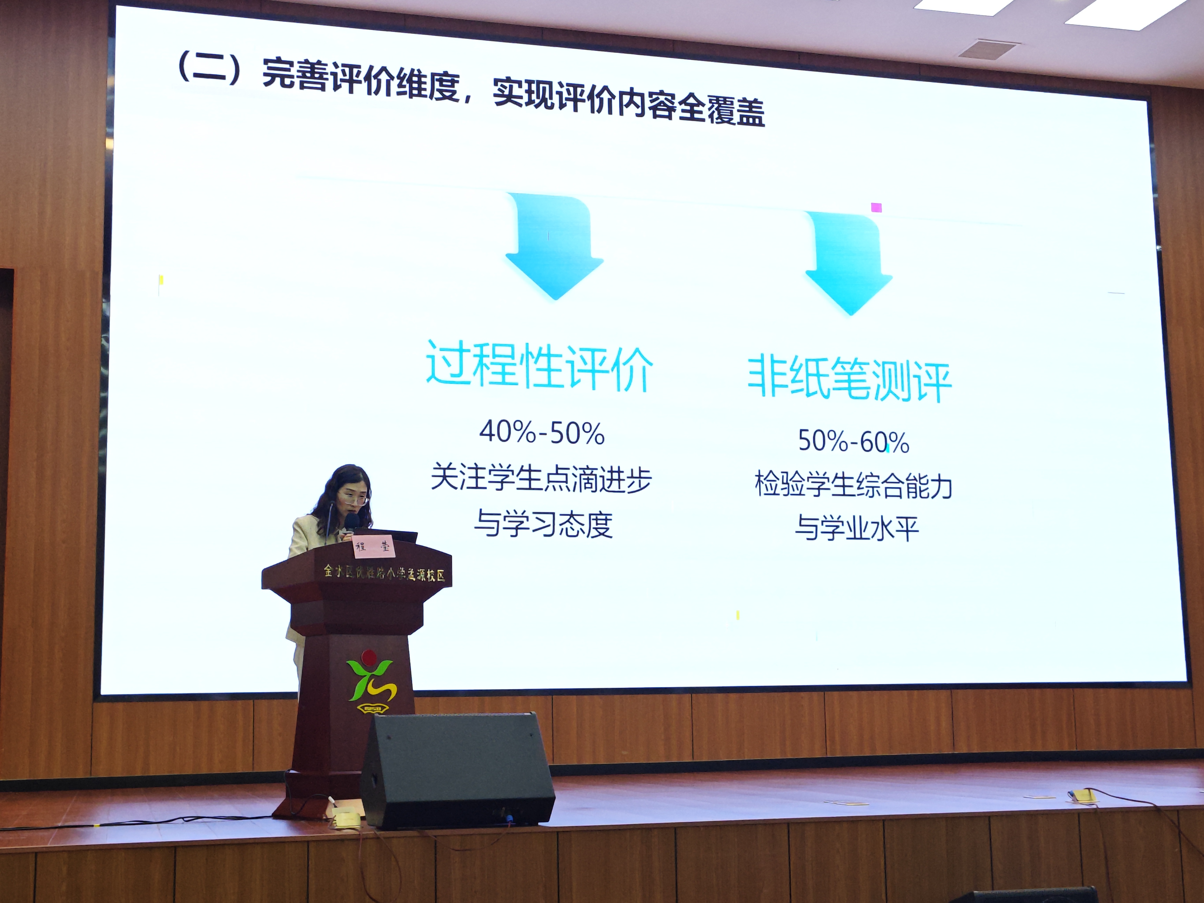 首先,二七区教育发展研究中心教学研究室小学语文教研员程莹以“让评价看见儿童的生长——素养导向下低年级语文非纸笔测试的区域探索”为主题展开分享。程莹立足低年级学生认知规律与学习特点,从“现状审视、体系构建、实践深耕、提质展望”四个维度,系统梳理了二七区在低年级语文非纸笔测试中的创新探索。她结合区域内多所试点学校的鲜活案例,详细展示了趣味化、情境化、结构化的低年级语文评价项目,让评价从“纸笔检测”转向“素养观察”,从“结果评判”转向“过程陪伴”。程莹精准捕捉儿童成长细节,真正发挥评价的育人功能,为低年级语文非纸笔测评提供了鲜活的实践样本。
