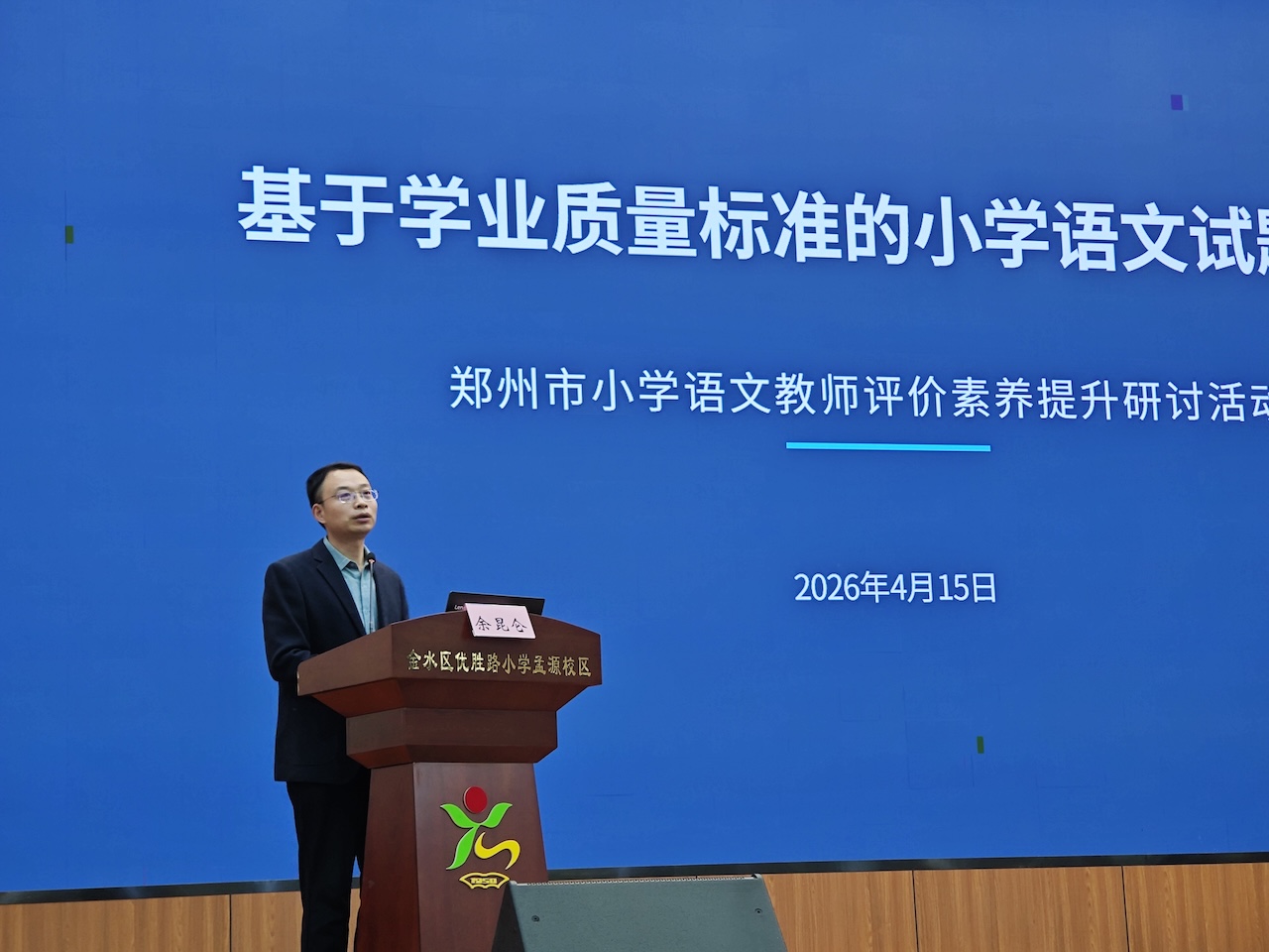 为深入落地《义务教育语文课程标准(2022年版2025年修订)》精神,全面提升全市小学语文学科教师评价素养与命题能力,4月15日下午,郑州市小学语文教师评价素养提升研讨活动在郑州市金水区优胜路小学孟源校区开展。郑州市基础教育教学研究室语文教研员余昆仑、金水区优胜路小学教育集团党委书记牛保华,以及全市各区县(市)小学语文教研员、命题骨干教师代表400余人齐聚现场,聚焦素养导向下的评价改革核心主题,共探评价新思路、共研命题新方法,助力全市小学语文教师评价素养提升。