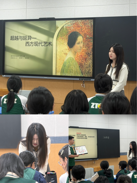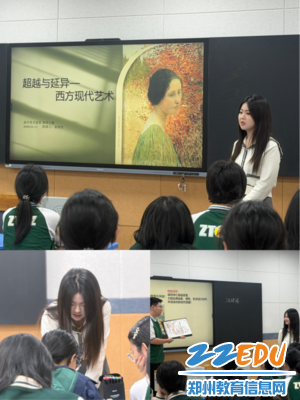 郑州市第一〇六高级中学崔雨佳老师率先授课,她以史为纲、循循善诱,以西方古典艺术到现代艺术的时代跨越为切入点,层层拆解艺术流派核心差异,梳理现代艺术变革的时代背景与艺术逻辑。课堂以经典艺术作品为依托,引导学生对比分析、深度思考,搭建清晰艺术鉴赏逻辑框架,夯实学生艺术史知识储备,培养审美思辨能力,课堂严谨、底蕴深厚。课堂上学生积极互动,展现出美育特色示范校学生扎实的艺术功底。