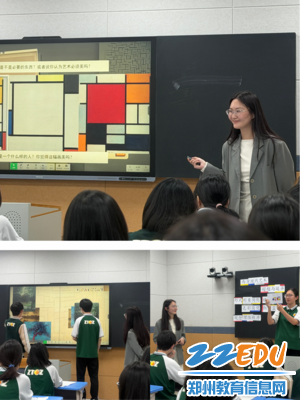 郑州航空港区外国语中学张晨曦老师另辟蹊径,以趣为引、沉浸互动,摒弃传统讲授模式,融入游戏化教学与实践体验。她以蒙德里安经典作品为核心,通过互动游戏、创作情境模拟等环节,让学生亲手参与、主动探究,在实践中感受几何抽象艺术的风格特点与精神内涵。课堂氛围轻松热烈、互动性强,推动学生从被动听讲转为主动探究,唤醒艺术感知力与创造力,课堂灵动鲜活、趣味盎然。