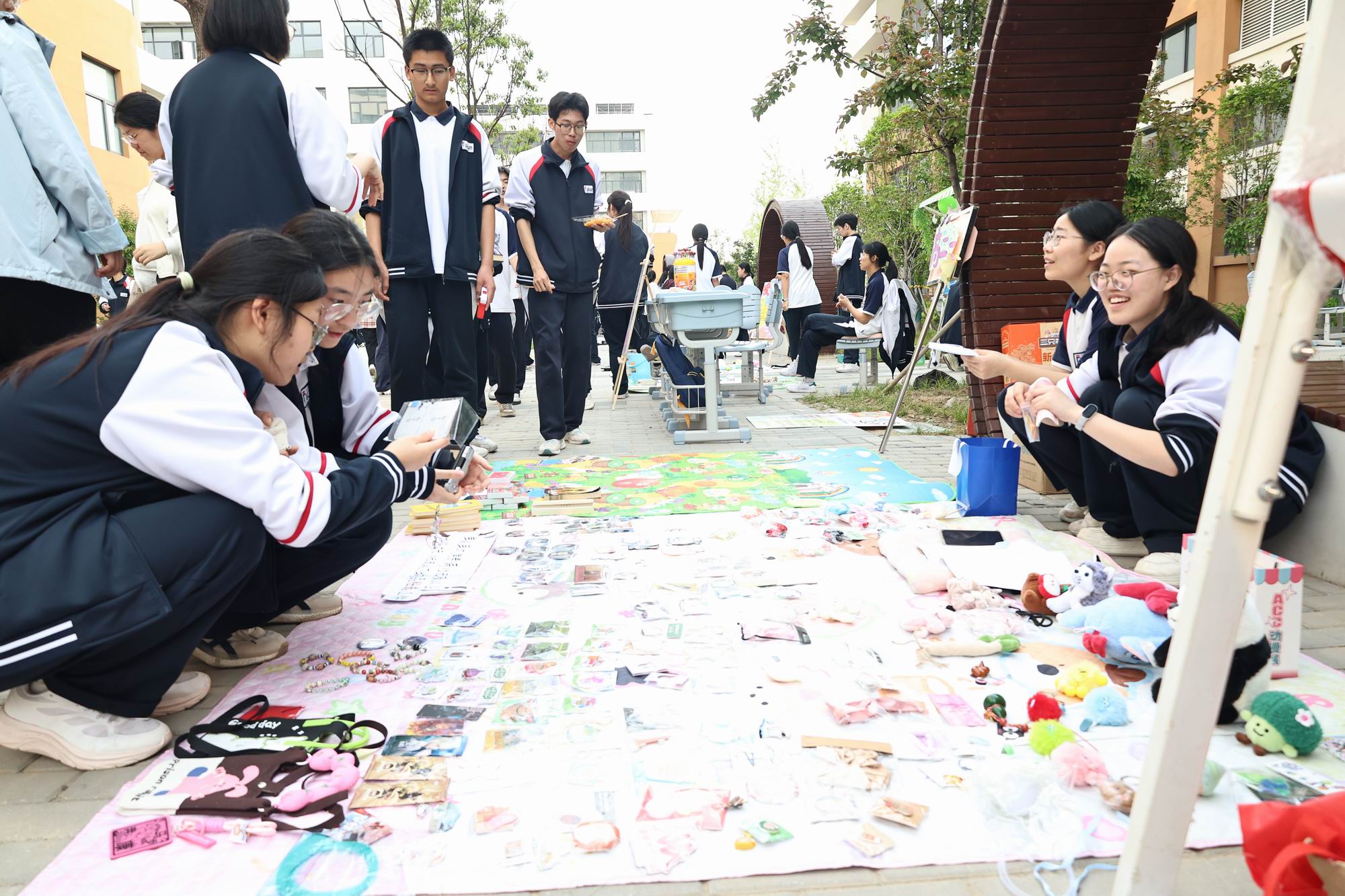餐厅门口同步开启的“春风起,故事生——旧物漂流记”爱心集市,尽显温情。高二年级各班以“故事发芽铺”“旧物新生站”等创意名称设摊,每一件旧物均附带“漂流日记卡”,记录物品来历与主人心愿。一本走过迷茫期的书籍、一支陪伴学习的笔,在交换中完成情感的传递,300余件旧物实现故事的新生。