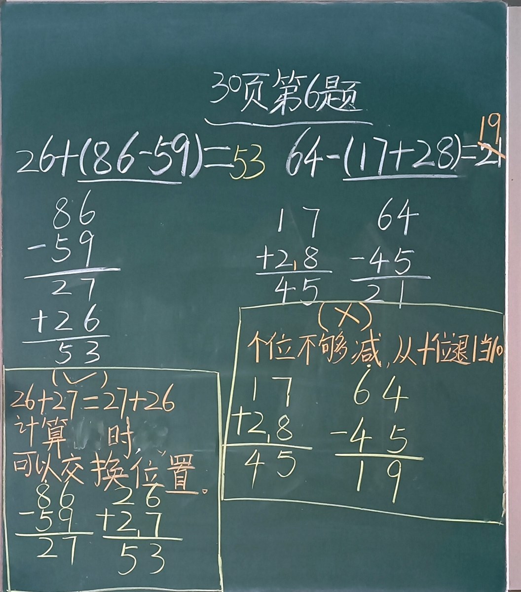 我趁机出示了数学书第30页的第6题,每一个合伙人都很默契高度配合,快速地拿出课前准备的1号本(课堂练习本)和削好的铅笔,开始磨刀小试。因为有了例题的铺垫,我下讲台转了转看了看他们做的情况,大部分孩子能计算正确,列竖式时候非常认真,细心,还反复检查。