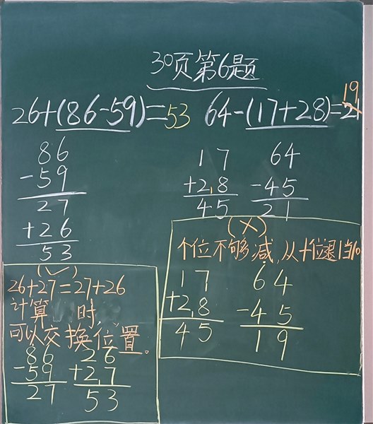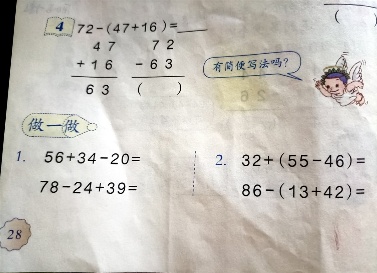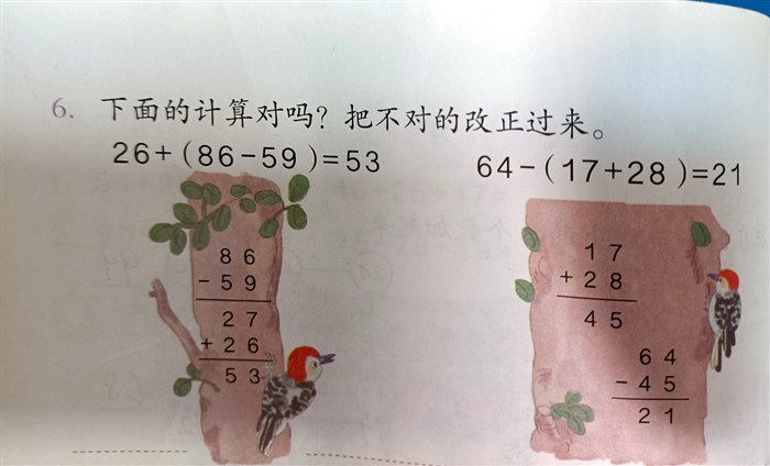今天领着孩子学了二年级上册数学第二单元《100以内的加法和减法》第28页例4,在学生已初步掌握加减混合竖式的计算方法及简便写法,能够按照从左到右的运算顺序进行正确、灵活地计算的基础上,学习含有小括号的加减混合运算中,引领孩子去学习。
