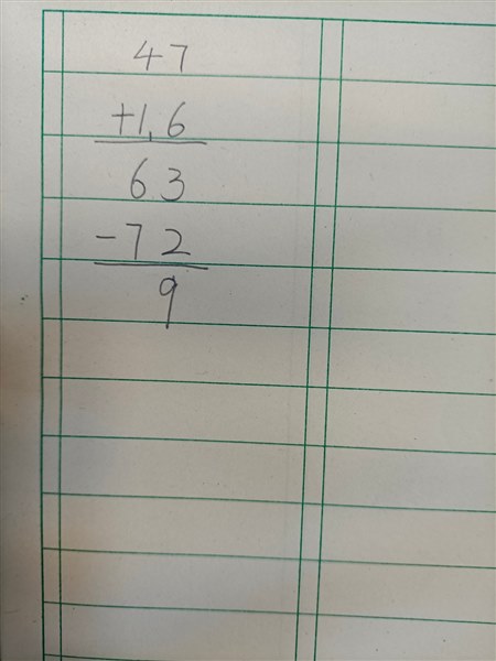 通过“合伙人”——我与学生润物细无声地学习这个例题中,每一位学生通过看、听、说、写掌握了这种含有小括号的加减混合运算题,并能用一般的方法列竖式,此时我看到每一位学生学习的劲头像燃烧的火旺旺升起,我知道高潮点马上就要来了。我微笑地说:“前段时间我们学习的连减、加减混合都是有两种方法列竖式,分别是一般的写法(分部列竖式)和简便的写法(列成一个大竖式)。尤其连加还有三种方法列竖式,不仅有一般的写法,还有两种简便的写法,那这道含有小括号的加减混合题列竖式时候是不是也有简便的写法啊?”问题刚一落地,大部分孩子说:“有!”我立马笑地更灿烂说:“既然你们都说有,那我们现在做个小小的数学家或者探究家,拿出1号本(课堂练习本)动手把这个简便的写法列出来吧。”此时孩子还不知道我笑的真正含义,刚才举手说“有的”同学还以为我过会该夸他们有想法,过了2分钟,我说你们写出来了没有?谁愿意上台演板展示,最后宗子涵面带自信满满的笑脸,踏着神气的脚步上台,像个“小老师”模样地用粉笔写下了他的简便写法。写了以后,我没吭声,假作沉思状:说“子涵是个善于动脑的孩子,在这一点上我们应该向他学习,但是他这个简便写法是对的吗?”细心的闫翀翔举手了,被我点名后站起来声音洪亮地说:“老师,子涵写得不对,因为他列的这个简便的写法(大的竖式),把原本的题72-(47+16)=改成了(47+16)-72=,况且像63-72=这样的用较小的数-较大的数的题我们也没学过,也不会算,粗心大意的他把本来是被减数为72看成了减数,所以他这个简便写法是不对的!”我举起了大拇指,孩子们心领神会地边鼓掌边说:“棒棒棒,你真棒!”