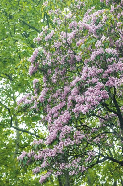 楸树是一种非常环保的树。它望之如桐,但叶子比桐树小,花比桐花精巧。它不像黄山栾一样容易滋生病虫害,也不像杨树柳树那样会滋生飞絮,更不像法桐那样孕育毛球,即便落花,也在短时间内。花儿随风飘落,仿佛给大地铺上地毯。