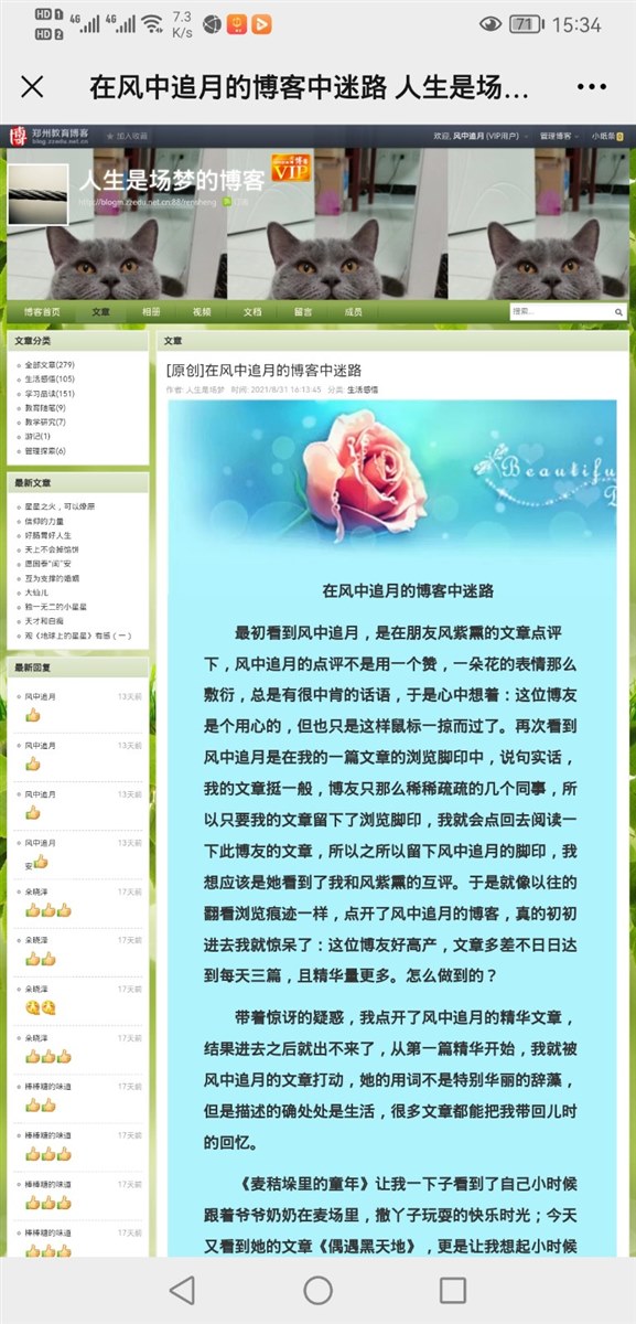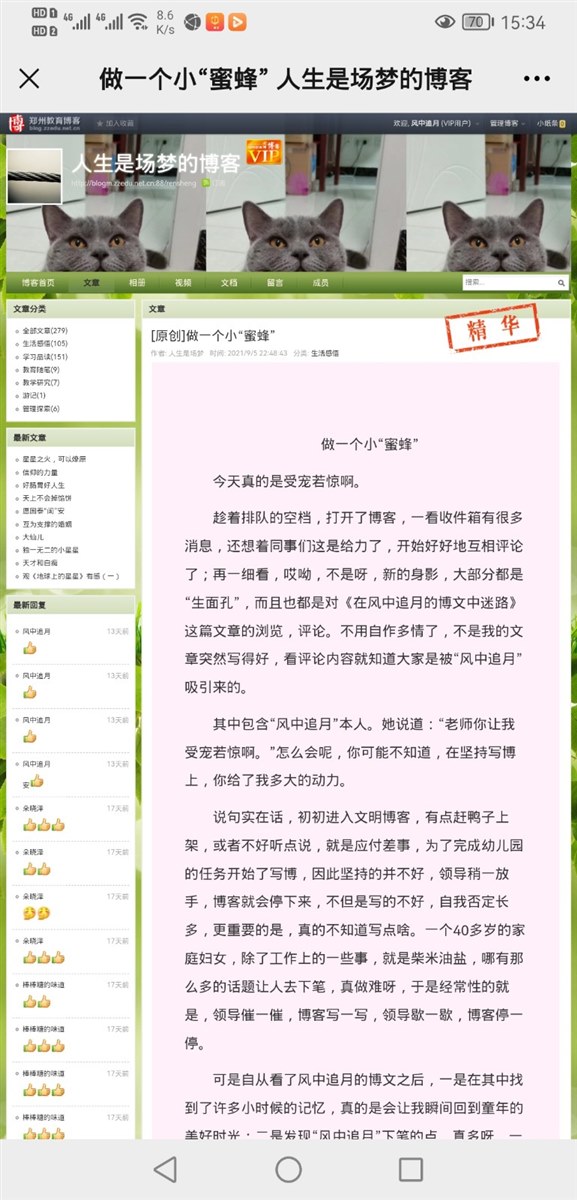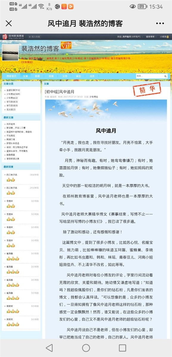 | 做一个内心有光的人 晚上打开郑州教育博客后台,在少年博览类精华博文列表里最上面的“风中追月”四字赫然映入我的眼帘,这不是我的昵称吗?这是谁把它用作了博文题目? 怀着一颗好奇心,匆忙打开博文链接,原来是我熟悉且崇拜的浩然同学。细读博文内容,天呐,才华横溢的浩然同学竟然把我比作一本厚厚的大书,实在愧不敢当。 比起小博友们的博学才识,多才多艺,我需要学习的地方还有很多。通过与小博友们的互动,我发现小小年纪的他们可真不简单,浩然同学可以称得上是博览群书,文字功底了得,每次读过他的博文,我都感到十分汗颜。却又怪自己语拙词穷不达意,无法用文字表达出一个孩子的优秀,实在是羞愧难当。 我写博的初衷是陪伴儿子,提高他的写作水平。一年多来,自我感觉对儿子的写博兴趣影响不是太大,很多时候都是我提醒他,逼着他写,主动写的次数少之又少。也或许这是当妈的通病,总是嫌自己的孩子不够努力、不够优秀,动不动就拿别人家的孩子作比较。 每当我坐在电脑前码文字时,先生总是会对儿子说:“看你妈为了影响你,带动你,提高你的写作水平,坚持的多好,你要是能有你妈的一半精神用心去写博就好了。”很多时候,我就在想,都是同龄人,如果我儿子能像裴浩然、名媛宝贝、苏心悦、蜜蜂巢、姚力萌……这些孩子一样努力,一样优秀该有多好呀。 也许我是当局者迷,眼里只有孩子的缺点,看不到孩子的优点,其实儿子也一直从赛初坚持到了赛尾。只是儿子不善于用文字表达情感,在一些小博友的心里,他们把我当成了自己的老师,自己的家人,当成了能谈得来的知心朋友。我想儿子也应该有同样的想法,我本来就是他的妈妈,我在写博中的坚持与收获,他从内心一定也是感到无比骄傲和自豪的。 还记得人生是场梦老师写的一篇博文《做一个小“蜜蜂”》,文中说在坚持写博上,我给了她很大动力。看了之后我很纳闷:你我素不相识,我怎么就会给了你动力了呢?她说初写博时就是为了应付差事,完成任务。但是看了我的博文后,她觉得生活真实而美好,只想跟着我的文字一起沉浸其中,看一看美好世界,过一过惬意人生。还说我的每一篇博文都是她坚持写博的动力,哪怕是为了到我的博园逛一逛,也要经常打开博客,这样怎么会不坚持呢?甚至又专门写了一篇《在风中追月的博客中迷路》,把我感动的一塌糊涂。 其实博友们不知道,正是因为你们的喜欢,我才得以坚持到现在。每当我心生懒惰,不想写时,总会想起可爱的你们,想起你们对我的期盼,我又怎会舍得让你们看到我的博文停止更新的那一刻?因为我知道这种心情很煎熬! 我最喜欢的慢摇摇老师不知什么原因已经停更20天了,还有我喜欢的一颗糖的甜老师也停更两个月了,但我每天还会到她们的博园转一转,看有没有更新。每次都是失望而归,看不到老师的文字,心里的失落感一直萦绕心头。我不想让喜欢我的你们有我这样的感受,所以我每天努力更新博文,告诉你们生活真的很美好,让我们在彼此欣赏与鼓励中,一起走在快乐的写博路上。 坚持写博,用文字记录生活,无形中影响了很多人,这是我万万没有想到的。我写着自己的博,记录着自己的故事,却能够带动着别人在写博的道路上越走越远,我感到很荣幸。这使我想到,人,不必有倾国倾城之容貌,也不必有腰缠万贯之财富,甚至不必有博大精深之才学,人最重要的是用一生去坚守并笃行应该恪守的品格。而我一直在用手中笨拙的笔书写着善良、正义、担当,传递着正能量。 有人说:一个内心有光的人,不仅能照亮自己,同时也能照亮别人,在他们身上散发着强烈的正能量,所到之处皆能形成一种有力磁场。我愿做这样的人,用最好的状态去感染身边更多的人,为他们输送阳光绽放芳香。 努力做一个内心有光的人,明媚自己,也明媚世界。 (感谢博友们让我有机会进入你们的博文中,和你们一起传递美好!)