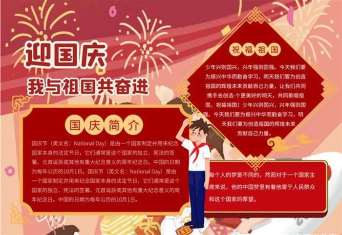 | 国泰民安,普天同庆 ----国庆 “礼炮声声震天下,五星红旗似彩霞。”在这金桂飘香,秋高气爽的10月,迎来了我们祖国母亲的72华诞。今天全国各族人民都满怀喜悦,大江南北的中华儿女都纵情高歌,祝福着我们古老又年轻的祖国!大街小巷的店铺门口都挂上了鲜红的五星红旗,到处张灯结彩,洋溢着人们欢欣若狂的心情。天空红艳艳的,万里无云,空中一轮太阳见证着我们中华儿女经历的风风雨雨。 中华民族几经沧桑,几经痛苦。我们忘不了圆明园那烧了三天三夜的火光,忘不了公园门口竖着的“华人与狗不得入内”的牌子,忘不了敌人用同胞们做的丧失人性的实验,也忘不了南京大屠杀的尸横遍野,血染长江。但中华民族绝不是任人欺负的“软骨头”,于是各地的中华人民奋起反抗,抛头颅,洒热血。即使牺牲自己的生命也在所不惜。72年前的今天,也就是1949年10月1日,伟大的领袖毛主席站在天安门广场,用宏伟的声音,向全世界宣告着新中国的成立。在新中国刚刚成立不久,就又拉开了抗美援朝战争、中印战争、西沙海战等战争。直到1978年,中国才开始进行发展。在那个年代,新中国的经济非常落后,有些人甚至连饭都吃不饱。但党和人民面对一个满目疮夷的中国并没有退缩,而是坚持不懈,勇往直前。在近代,中国的发展可谓是日新月异,从以前的自行车到现在的飞机轮船;从笨重的电话到现在技术先进的华为手机;从吃不饱的豆糠小米到五花八门的特色美食…… 我们的祖国就像一条腾飞的巨龙,前途不可限量。在每年的10月1日,我们为祖国母亲庆生,普天同庆,向全世界展示着“中国力量”。中国,我们的祖国。她由一个积贫积弱的国家一跃成为了世界顶尖强国,这背后离不开几代人的辛勤努力,呕心沥血,正是因为有了他们这些优秀的中华儿女,我们的祖国才能变成今天的样子。 我为我是中国人而感到骄傲与自豪!那黄山是我高挺的胸脯,长江就是我沸腾的热血,延绵长城是我扬起的手臂,泰山是我站立的脚跟。我是指南针与印刷术的后裔,是圆周率,地动仪的儿女。我的声音响彻在联合国大厦里,也回荡在奥林匹克竞赛的赛场上。我骄傲!我是中国人。我自豪!我是中国人。 |