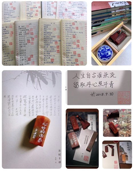 看我那么喜欢印章,在杭州孤山,爸爸特地带我去西泠印社参观。在那里,我见识到各种各样的印章:有凹刻阴文、有凸字阳文、有四面印文、甚至圆轴滚印……印章文化逐渐印进我的心里。印章,与书法、绘画、诗歌并称中国四大传统艺术。“印”字左半部是个爪字,是手持的意思;右半部是个节字,就是凭证,合起来就是手持凭证,代表诚信。传国玉玺、调兵虎符、断案官印,时代的震荡与更替,聚焦于一玺一印的传承中,凝聚在中国文化的清雅审美中,是华夏文明的重要见证。