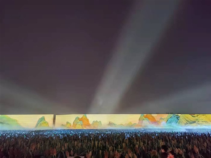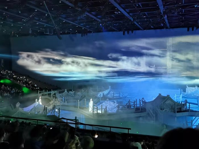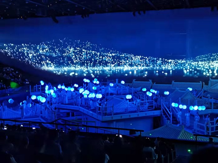 这里有21个剧场,3个大剧场,18个小剧场。我们观看的第一部小剧名字叫光与影,这是一部没有人表演的剧,这部剧的唯一主角就是光。五颜六色的光,姿态千变万化,如同调皮的孩子在躲躲藏藏,怎么也抓不到他。他时而在舞台上前后走动,时而在我面前闪动,时而又调皮的在我头上玩耍。