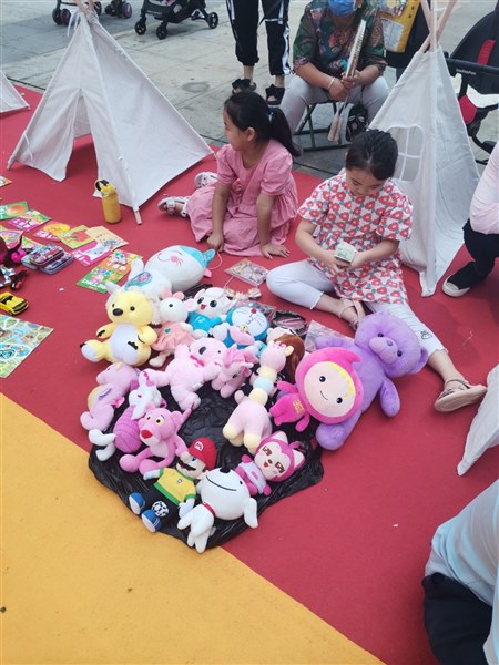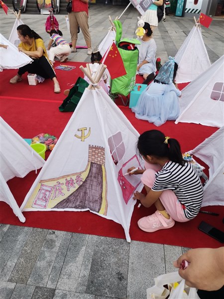 活动已经开始啦,叔叔给我们每个人参加活动的人都发了小帐篷,还给我们每个人脸上贴了小红旗。帐篷是白色的,我们把帐篷撑起来开始在上面开始画画了。大家画的都不一样,有的画了长城,有的画了国旗,有的画了房子,而我画了一条乡村小路和一国旗。画完帐篷我们就开始跳蚤市场活动,我们坐在自己帐篷前边,把自己要买的玩具摆在地上,有的还准备了收款二维码,看起来很像回事呢!看有个小女孩面前放满了各式各样的毛绒玩具,已经有小朋友在挑选自己喜欢的了,我也买了自己喜欢的一条贝壳项链,漂亮极了。