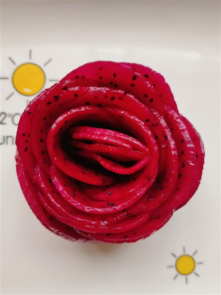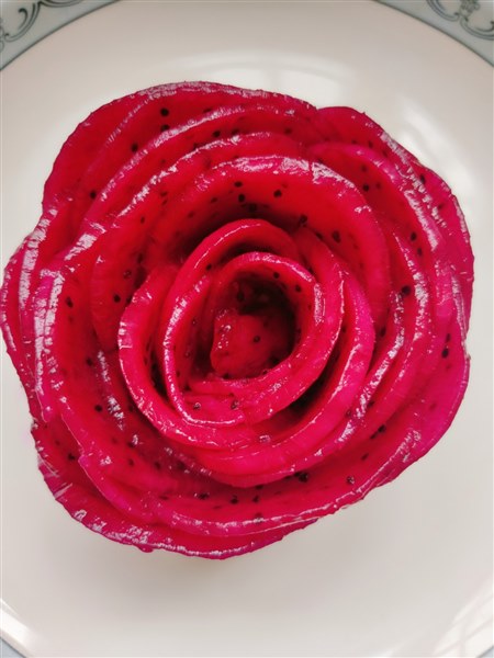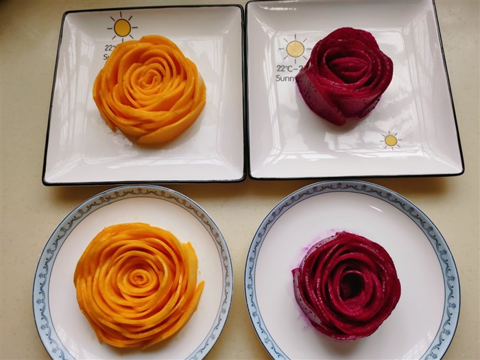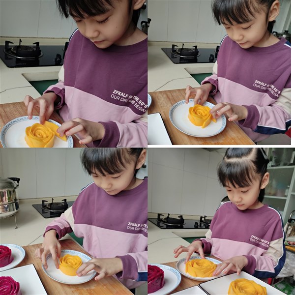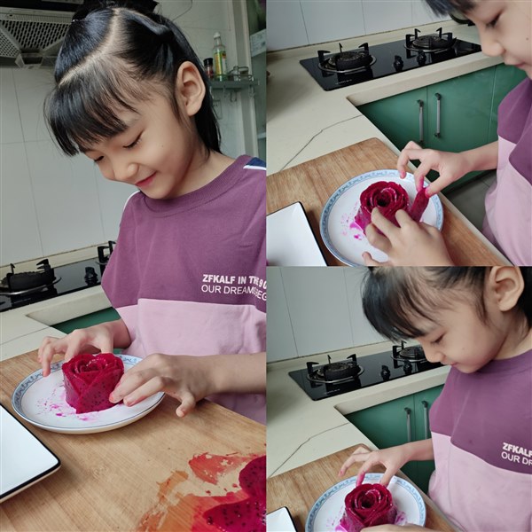 | 今天是国庆假期第四天,天气有风且微凉,那就呆在家里陪着贝贝完成实践作业吧。 贝贝的假期作业有一项是要做一个创意果盘,我问她有没有想做的能做的且很美的果盘。贝贝想了想说那就做个玫瑰果盘吧,用火龙果和芒果。我以前给她做过她自己也做过,那就做这个。于是,我俩出去买了火龙果和芒果。 一个大青芒,洗净削去皮,纵着切掉左右两半;一个红心火龙果,洗净揭掉皮,对半切开。我把火龙果和芒果均匀地切成薄片,我和贝贝各用一半。做得过程贝贝已经很熟悉了,于是我俩各做各的,我还要负责给贝贝拍照呢,毕竟这是作业要有过程要留痕。 先用火龙果做朵红玫瑰吧。从最小片开始拿起,慢慢卷起花心,在一片一片轻轻包裹成花型,贝贝做得认真极了,一层一层的花瓣密密实实、挤挤挨挨,玫瑰花的样子在她的小手中脱颖而出。我说:“贝贝认真做事的样子真好看,比花还要美。”贝贝笑眯眯地说:“妈妈,我是在很用心地做,但是我觉得没有妈妈做得好看。”哪里,我们俩做得红玫瑰都好看,各有千秋。 接着用芒果做黄玫瑰,芒果的果肉较之火龙果有韧性,所以更容易成型,很快我们俩都做好了。两朵大大的黄玫瑰金光发亮,真是养眼!拍出照片就更好看了。一起动手做了红玫瑰和黄玫瑰,这个过程是我俩都很享受的。哈哈,我们俩的心情都如同这红黄玫瑰花一样,明媚美丽,暗香浮动。 贝贝说她想突然起一个故事是红玫瑰和白玫瑰,我们的红玫瑰一样,只是把白玫瑰换成了黄玫瑰。呵呵,这是哪儿跟哪儿?我大脑飞速旋转,跟不上她的节奏。思维跳跃的小贝贝,还真是可爱。 做完了,拍好照片了,那就可以开吃了。每次吃玫瑰花样的火龙果芒果,贝贝都是小心翼翼的,先从最外层开始,一层一层吃掉,一点一点看着玫瑰花变小,变小,直到消失。见我从花心吃起或是粗暴用叉子挑起边缘,以至于整朵花瞬间凋谢,贝贝都是一脸嫌弃,她说:“妈妈,你怎么可以这样吃呢?我都不忍心也不舍得把它弄烂,你看这样从外到内一层层吃起来,花一直是很好看的花,多有意思呀。” 看着贝贝盘子里变小但依然很美的玫瑰花,看看我盘子里堆成一滩的果片,我也开始嫌弃自己了。我说吃下一朵时要向贝贝学习,认认真真仔仔细细地把花吃掉,让花在眼前保留的时间多一些再多一些。贝贝满意地笑了,说这样吃起来会更开心的。我试了试,果然如此。 爱动手快乐多,眼里有美心中有爱的小姑娘,轻轻松松完成作业啦! 创意果盘,虽然结果都是吃掉它,但是因为过程不同而吃起来的味道就更鲜美了,动手了,饱眼福,暖脾胃,又润心养情,真是一举多得,多好! 美哒哒的玫瑰花,一起来看看吧。 |