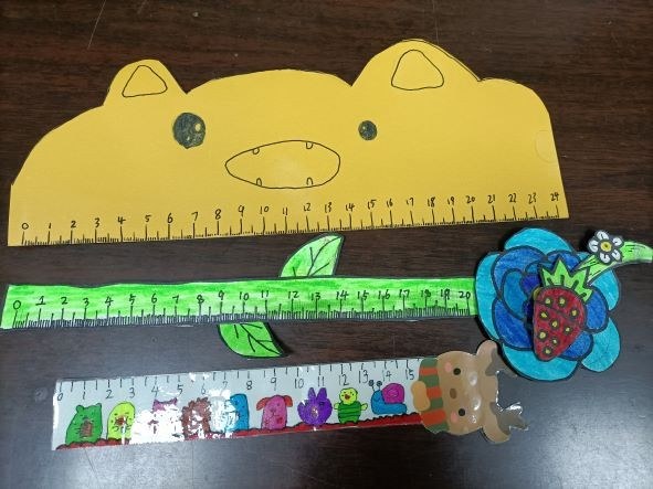 | 创意手工——自制尺子 齐小 李宁 今年郑州受疫情影响,9月份初我们上网课,我和闫老师商量先讲第二单元《100以内的加法和减法》,因为第一单元《长度单位》需要孩子们认识厘米和米,认识线段。 这个单元的内容如果想学好,考验老师与学生的线下课堂活动是否做到位有关!这个单元的课堂必须通过师生面对面地看一看,指一指和说一说;手把手地量一量和画一画、读一读和写一写这些线下活动,才能使孩子认识单位厘米、米和线段,形成1厘米与1米实际长度的表象,初步建立1厘米和1米的长度观念,了解线段的基本特征,并在线下课堂活动中老师亲眼看见学生会用尺子量比较短的物体的长度(限整厘米),量比较长的物体的长度时候是用米做单位,这样才能更好地认识并掌握米和厘米之间的关系,知道1米=100厘米,在此基础上学会用尺子测量线段的长度和画线段的方法。最重要的是能结合具体事物,运用单位与数据现结合或借助参照物的方法,选择合适的长度单位。(重点)并能在解决问的过程中,建立米与厘米的长度观念。(难点) 10月8日我们学习了第一单元《长度单位》第一课时认识厘米。 一、情境导入 我出示了图片并问:莹莹想做一双新鞋,但是她不知道自己脚的长度,该怎么办呢? 同学们,你认识这些文具吗?大家来帮莹莹找一找,哪个文具可以测量脚的长度呢?是铅笔?是橡皮?直尺?还是圆规呢?(出示课件图片:有圆规,有铅笔,有直尺,有橡皮) 这时我一边拿了个直尺,一边说:“我是测量长度的小能手,一起来了解我吧!” 二、探究新课 我们一起来了解一下直尺,在了解之前,请同学们跟我一起回到古代,(出示课件)看看古人是如何测量物体呢?古人把手臂伸开,这个长度叫1庹,1庹也就是伸开双臂的长度,量一量这块巨石是几庹(2庹宽)。 量一量这块布有多长呢?我们可以把大拇指与中指伸开,1拃就是大拇指和中指的最长的距离。我们一拃一拃的量,1拃、2拃、3拃、4拃、5拃,那就可以说这块布有5拃长。 除了用一庹和一拃来量物体的长度,我们还可以用脚来量,这里有一根竹竿,这个是1个脚长,我们来量一量这个竹竿,1个脚长、2个脚长、3个脚长、4个脚长,一根竹竿有4脚长。 现在老师和小明一起来量一量教室里的桌面是几拃长,小明量得这个桌面有5拃长,老师量得这个桌面有3拃长。 咦,量的都是课桌的长,为什么量的结果不一样呢? 我们仔细看,这个是小明的一拃长——短,这个是老师的一拃长——长,它们的长度是不一样的,那测量标准不同,所以测量的结果就不一样了。 小明测出桌面的长度是5拃长,老师测出桌面的长度是3拃长,原来是因为它们的测量标准不同呀,这就需要统一单位长度。 我们经常用直尺来测量长度,尺子是测量长度的工具。是统一的单位长度。 大家仔细观察,尺子上都有些什么呢? 尺子上有刻度线,还有刻度0,在测量的时候,我们经常把刻度0作为测量的起点,还有单位长度厘米,厘米是国际上统一使用的长度单位,“厘米”可以用字母“cm”来表示。 我们再看,直尺上还有一些数字,0、1、2、3、4这样的数字,0到1之间的长度是1厘米。请同学们伸出拇指和食指,量一量1厘米大概是多长,1厘米大概这么长,从0到1之间的长度就是1厘米。 除了这里的1厘米,尺子上还有1厘米吗?我们来看一看,尺子上每相邻的两个数之间的长度都是1厘米。比如说1到2,它们之间的长度就是1厘米,2到3,3到4,4到5,5到6,6到7,7到8等,它们之间的长度都是1厘米!那些物体的长度大约是1厘米呢?请同学们想一想,我们的身边有没有长度大约是1厘米的物体呢? 我们的食指宽大约1厘米,同学们可以伸出你的食指,放在尺子上,看是不是占据了0到1的距离呢?还有田字格的宽大约1厘米,同学们可以拿尺子和田字格的宽比一比,还有我们生活中图钉的长也是大约1厘米。 认识了直尺,现在让我们量一量这张纸条的长度。怎么用尺子量纸条的长度呢?首先我们将尺的刻度0对准物体的左端,然后再看纸条的右端对着的是哪个数字?纸条的右端对着的数字是5,所以这个纸条的长是5厘米,同学们,你知道怎么用直尺去测量长度了吗? 测量长度有三步骤:首先先放平。(就是把尺子和要测量的物体都放正)再对“0”。(就是把直尺的刻度0对准物体的左端)最后再读数。(读的是什么数呢?读的是物体的右端对着的是直尺上的那个数,就读那个数) 三、练习巩固 现在我们用尺子来量一量这根铅笔,铅笔的长是几厘米?用刚才老师讲的三步骤量一下吧! 那今天我们认识了厘米,并也知道测量比较短的物体的时候要用的直尺,更让老师开心的是看到了咱班所有的孩子们都能用手中的尺子准确地量出这根铅笔的长度,那为什么我们现代人发明的这个直尺0刻度线没有在尺子的最左端呢?(也就是最左头) 孩子刚开始都在沉思,过了大约2分钟后,我们班的吴松松举手了,我示意让他起立,他自信妈满满并声音洪亮地说:“因为如果尺子的0刻度线在最左头,时间长尺子会磨损,那样我们就找不到0刻度线在哪了!”我追加着问:“所以我们的直尺上0刻度线都是在哪个位置呀?”同学们一起说:“在尺子最左端靠右一些!”说得真好,你们都是善于动脑的好孩子,只有勤于动脑才会善于动脑!老师给你们点赞!自我鼓励一下吧!雷鸣般的掌声默契地一起响起。 课上完,我在想下午的延时课作业布置什么呢?现代数学家经过多年的智慧研究和实验才发明了测量工具尺子,那