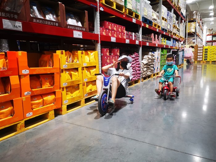 吃过饭后我们仨打车回王发小家,一路上车辆很少,蓝天白云伴我们前行,我不经感叹上海的环境真好!所以住在交通方便,环境优美的郊区也很舒适啊!到了家中王发小把孩子哄睡,我们俩也躺空调屋休息,并开启了我们的聊天模式,聊聊老家的一些人,一些事儿,聊聊各自的生活等等!在愉快的时光中时间总是偷偷的溜走,大概到了下午四点钟孩子也睡醒了,于是王发小带我去逛她家附近的山姆超市。我们骑小电车便出发了,在超市边玩边逛买了榴莲、菠萝、香蕉、车厘子、三文鱼,玫瑰花等等,我们的小车差一点就驼不动了,只能慢悠悠的回家!