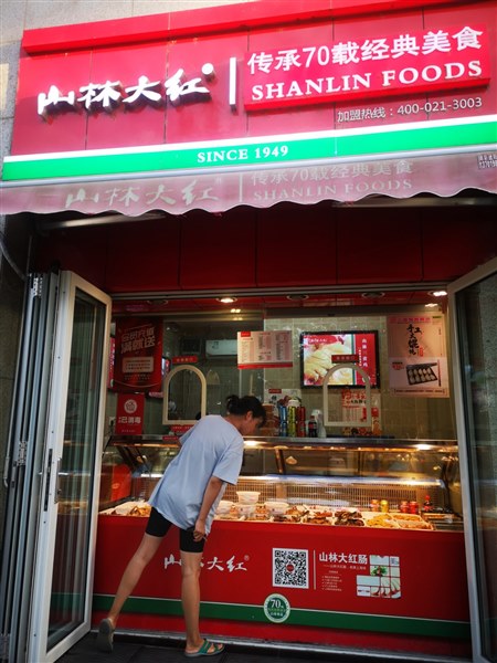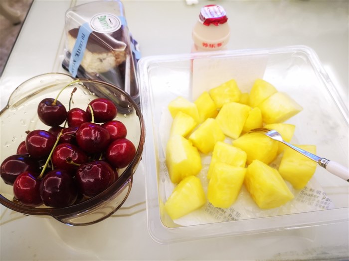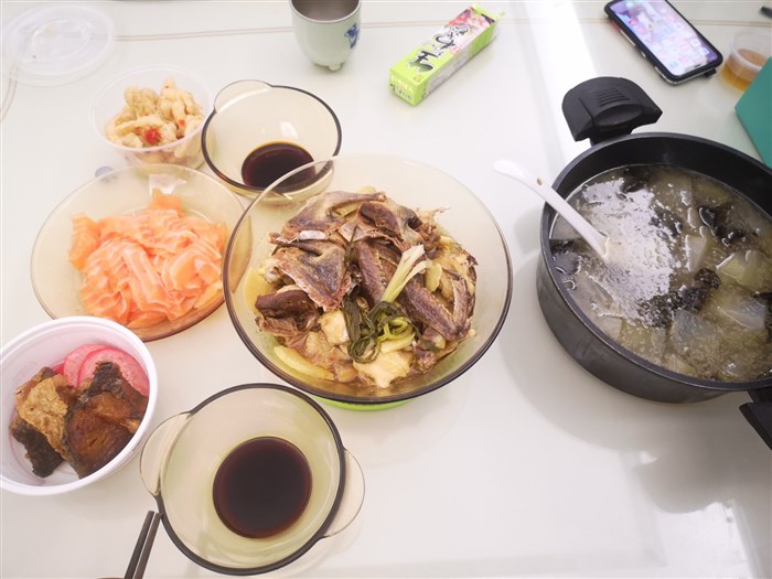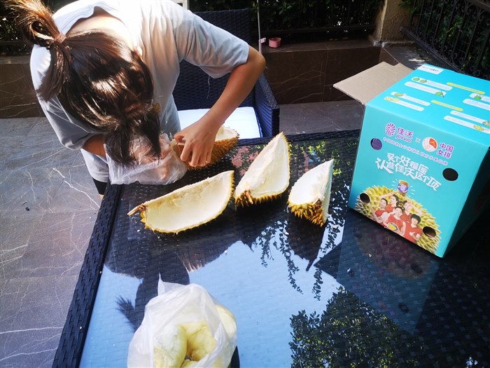 到家之后就开始享受买回来的水果,因为家里有不喜欢榴莲味道的老人,为了避免屋子里弥漫“臭味”,王发小只能到屋后小院里徒手剥榴莲!在我们享受着水果大餐的时候,孩子爷爷一直在厨房里忙活,做了卤鸽子,鸽子汤炖冬瓜木耳,还切了一盘三文鱼!最后王发小又骑车带我去她家的熟食店装了红肠,熏鱼和酸辣凤爪。因为员工休息,所以王发小老公要在店里上全天班!打过招呼后发小带我又去面包店拿了一些小蛋糕和甜点!家里好吃的真的想让我一个不落的全都尝一遍!就这样享受了一顿上海爷爷做的家常饭,还吃到了上海老字号的熟食品,熏鱼,红肠和凤爪十分好吃!晚上六七点吃过晚饭后又和王发小度过了开心的一小时,八点钟我也要准备回市区了。然后王发小给我装了一包吃的让我带走,有蛋糕,有熟食,还有榴莲!这真的是“吃不了兜着走”的架势啊!