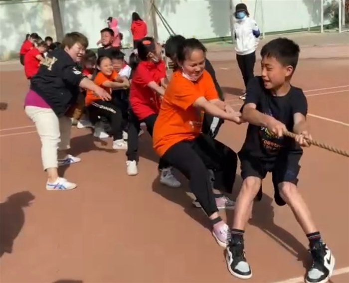哔哩……随着口哨的响起,一旁啦啦队瞬间喊了起来,只见带头的吴雨涵妈妈一边挥舞着双臂,一边大喊加油。在她的带领下,我们的啦啦队铿锵有力,刹那间就碾压了他班。随后原本弯曲的麻绳瞬间硬如木棒。只见我方大力士周天姿,使出五分力量,三分坚强,二分豪迈,合在一起十分用力的向后拉。多书阳脸红的像一个苹果,鼻子里喘着粗气,张着嘴巴仿佛可以塞下一个鸡蛋。郭承琛和郭承琳这两个亲兄弟把袖子扁的高高鼓鼓的,青筋暴起,由于太过用力,眼睛都眯成了一条缝。更有意思的是王一帆,直见他光光的头上,到处是汗珠,时不时大吼一声,仿佛带着他最后的倔强。可就算我们再用力,但对方依然轻而易举地将我们拉了过去。