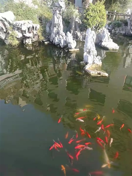 楼下有一个美丽的人工湖,虽小,却异常精致,极具江南风韵。亭台楼阁,假山水榭,曲径回栏,奇草怪石一应俱全。湖水清澈碧绿,水草丰美,一群小鱼儿在荷叶下快活地游来游去。这让具有江南情结的我很是欢喜。闲暇时分,或工作之余,常常一个人静静站在这里,看这群游来游去的小鱼儿,哪条是我的前世今生。