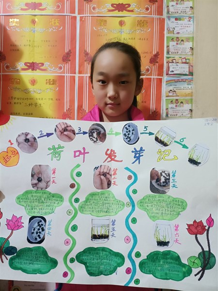 今天,老师让我们回家观察👀一种事物。我兴高采烈地跑回家,拿出早已准备好的荷叶种子,放在一个盛满水的小盆子里。看着圆滚滚的种子们,我猜它们一定在睡梦中,等着我明天来看它们,我心里真是又激动又紧张。