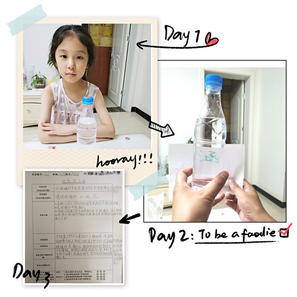 今天,科学老师在班级群里发了一个小实验,实验的名字叫“迷失的方向”这个实验是这样做的:首先准备一张纸、一支笔、一个玻璃杯,然后在纸上写上左右相反的字或图画。再将玻璃杯里装满水,把纸放到玻璃杯后方一定距离处,纸上的图画就会左右相反。以前我在电影里看过这个实验,但从来没有做过,所以我这次的心情非常激动。我和爸爸一起按照老师发的做,前面几步都很顺利,可是到了最后一步,我们发现,字没有正过来还是反着的。我们怀疑是不是杯子的问题,我发现老师的玻璃杯是没有条纹的,我们用的玻璃杯是有条纹的,我说:“爸爸,是不是我们的杯子上有条纹的问题呀?”爸爸说可能是我们就换了一个没有条纹的杯子,可是我们一试还是不行,我就想这次问题出到哪里了呢?我有点不想做了。爸爸说是不是因为这个杯子太矮了?于是我们又换了一个高一点的矿泉水瓶子代替玻璃杯,可是还是不行。我们仔细一看老师发的,就知道原因了,老师说的是把纸放到一定距离,我和爸爸都看成了把纸贴紧瓶子。我们又把纸放到瓶子后方的一定距离,终于成功啦!我和爸爸的心里都像吃了蜜一样甜。