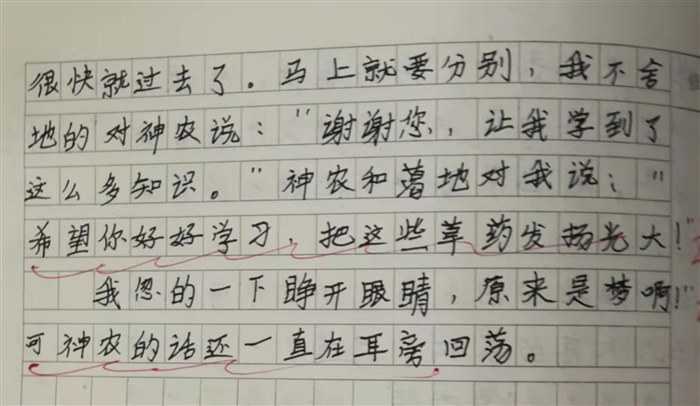 这样,我和神农一直在采药,一天很快过去了,马上就要分别了,我不舍得对神农说:“谢谢您让我学到了这么多知识。”