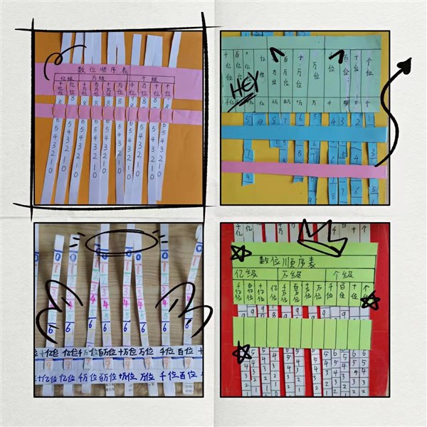 这里的“做”指的是动手操作。意大利著名教育家蒙台梭利说过:“我听到了,我忘记了,我看到了,我记住了,我做过了,我理解了。”蒙特梭利的教育理念是:发挥孩子的自主性。实践大于一切。听得再多,不如自己看一眼,看得再多,不如自己动手做一做。所以我们要想办法创造一切机会,把“静知识”变成“小活动”。比如,我校四年级范玉娟老师在教学“大数的认识”时,让学生动手制作活动的“数位顺序表”(如图)。