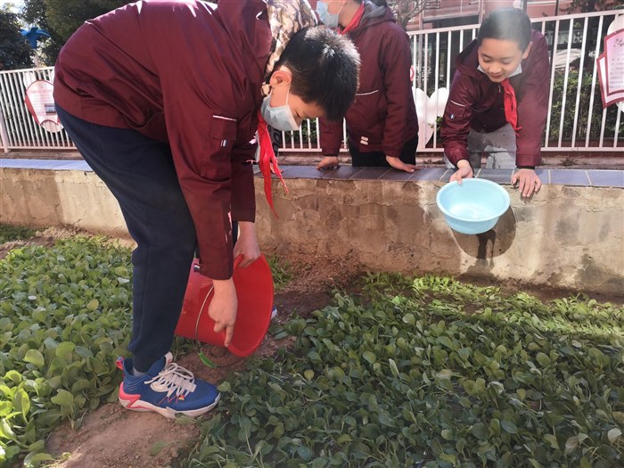 “一水护田将绿绕”,园中青菜在温暖的阳光中,长势喜人,一片盎然。经过50分钟的浇水,学生们通力合作,解决了很多实践中遇到的问题,将干旱的菜地,进行了灌溉。
