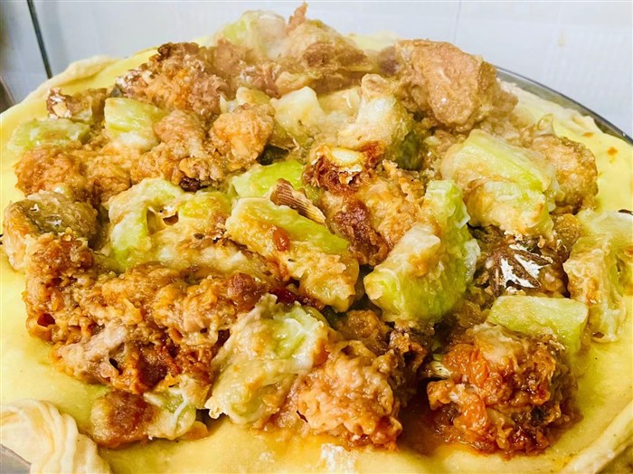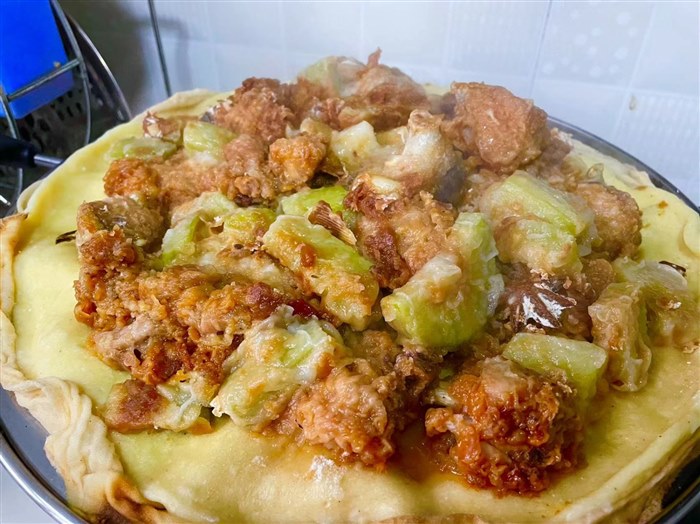当鸡肉腌制1个小时左右,白萝卜切成长条块放入肉内一块腌制,新鲜的萝卜在蒸制的过程中会充分吸收鸡肉的香气,软香可口,这样肉和萝卜交替吃,也会大大的降低油腻感,让味蕾更舒坦。不过,也有人喜欢再放些五花肉进去,这样吃起来更加的浓香,这些都是根据个人口味而定吧,我觉得也没有什么统一的食材搭配的要求。 当鸡肉慢慢腌制的过程中,开始制作饼,这个面饼在上锅蒸制的时候放在鸡肉的下面,面饼的厚薄依个人口味而定,不过,我觉得还是薄点好,感觉口感好。鸡肉在高温的作用下,多余的油脂溢出,然后鸡肉下的面饼尽情的享受来自高温后鸡肉的馈赠,就这样在时间的充分满足下,面饼有了肉香、萝卜的清香还有面粉的醇香……
