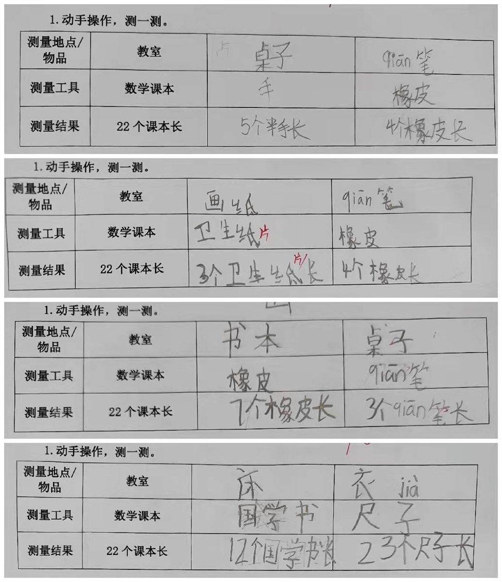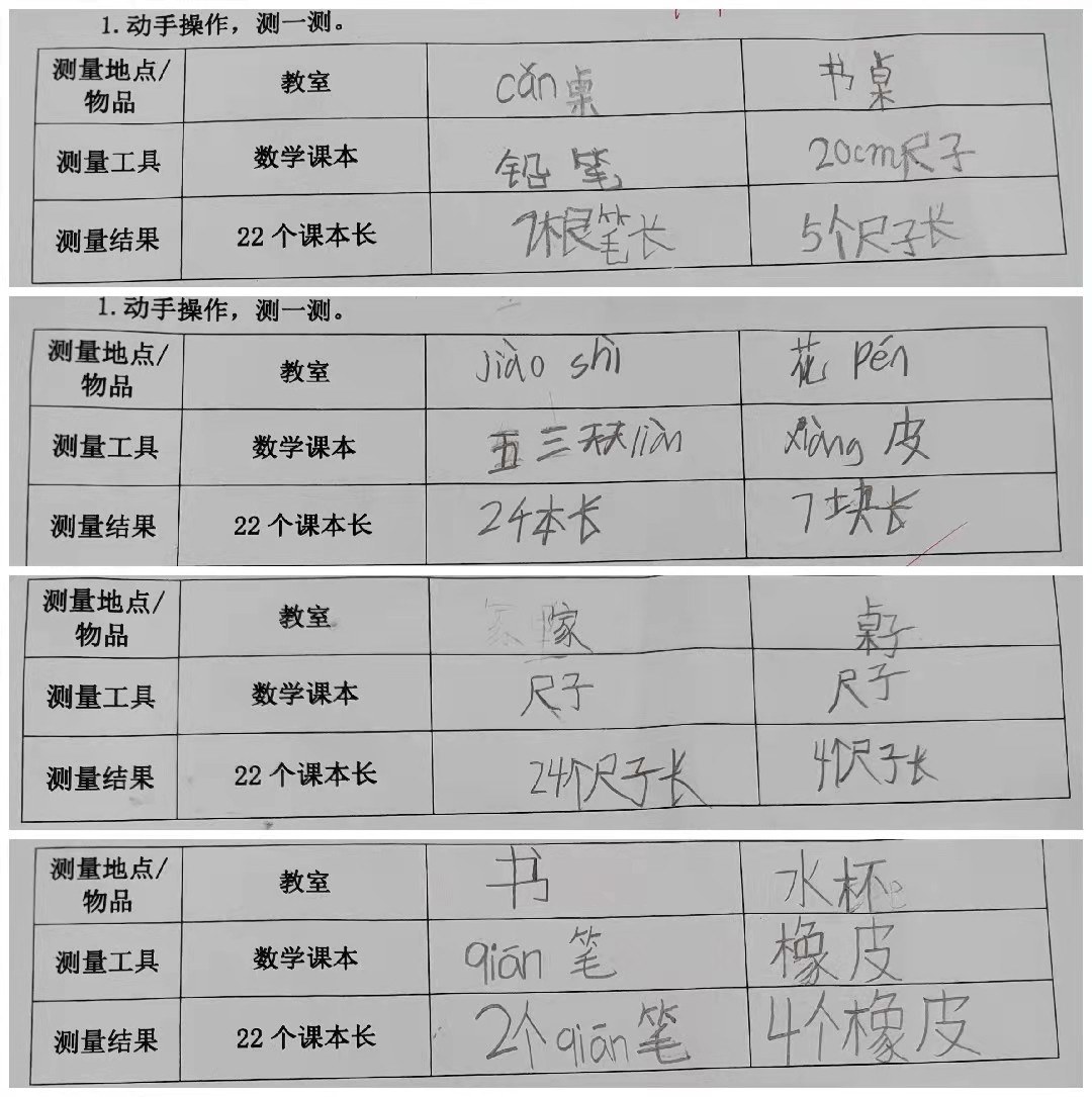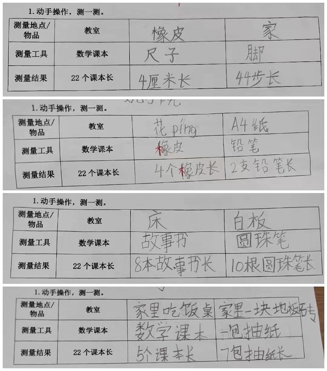 课堂外,将所学的知识延伸到家庭和生活中。孩子们选择不同的工具测量了床的长度、花瓶的高度、A4纸张长度、自己的身高、饭桌高等等,“小小测量员”们在观察、记录、交流、体验、思考中深化思维,真正地当着小小的数学家!