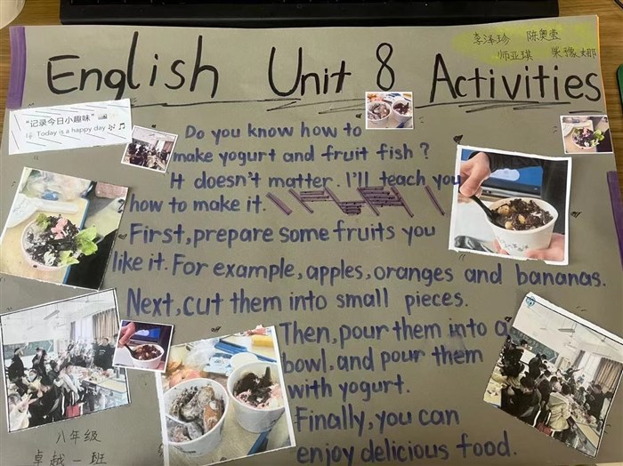 再比如在讲八年级上学期第八单元How do you make a banana milk shake?时,我发现这个单元的语法和内容并不是很多,对于学生来说掌握起来比较容易。所以我就想那这个单元就非常适合搞实践性课堂。所以让学生提前准备制作水果奶昔、水果捞、蔬菜水果沙拉、三明治的原材料。在英语课堂上进行现场的制作和美食的分享。看着学生们制作美食时开心的笑脸,觉得这节课也是值了。但最重要的一定是课堂过后的反馈。我让学生回家给父母制作一份水果奶昔。并把制作过程录制成视频或者以家庭简报的形式呈现出来,都要配以相应的英文介绍。学生们反馈给我的作业让我觉得非常欣慰。因为他们真正收获了。