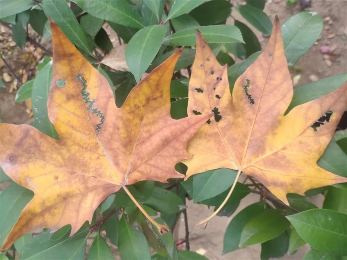 有两片好看的叶子,好似双胞胎姐妹,错落的躺在水泥道上,我弯腰捡起,她们身上雷同的花纹引起了我的美好猜想,不规则的窟窿,弯弯曲曲的小豁口,一看便知道是哪只调皮捣蛋的虫子在上边啃咬留下的齿痕。我小心翼翼的收起来,准备让她们陪着我走进今天的语文课堂。