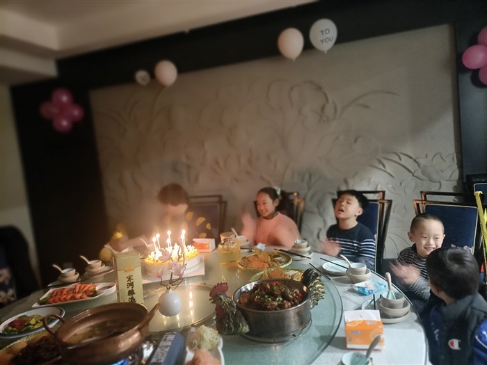 “孩子们,别玩啦,快点该吃蛋糕啦。”这时,我们的耳边响起了奶奶的声音,每个小朋友都像一个离弦的箭一样, “飞”到凳子上。
