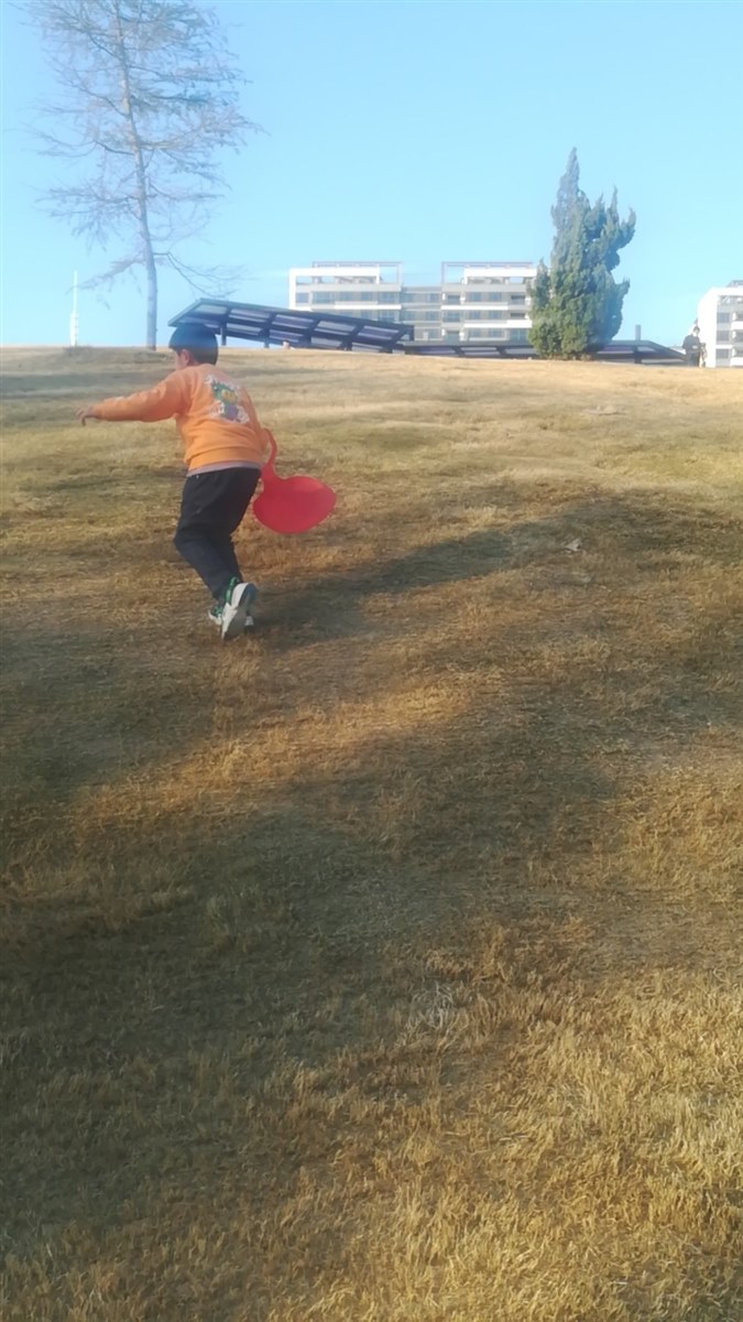 因为是天然滑草场,好多孩子聪明地拿着纸箱片,坐在上面,手里还拉着纸箱片的前面,滋溜就从上面滑到了下面,毕竟不是专业滑草的地方,有坑有岗的地方,速度还会稍微停顿;有的孩子很先进,看着是经常来这滑,拿着专业的滑草垫,就是那种下面是个塑料平面坐,前面是个拉手,可以坐上,拉着拉手往下滑,“真先进,我还是头一次见这东西,拐回来也给儿子买一个!”我给老公述说着。