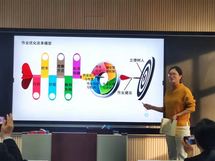 关于作业设计与布置:内容上精选精编且分层;时长上控制总量;考察方式要多元化;布置前教师先做;作业标准明确,同时作业全批全改,二次批改。同时根据不同知识、不同学生水平的特点,除了书面作业外,还设置如课外阅读、对话、演示、观察、实验、操作等探究性、实践性的作业。