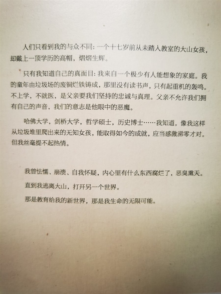 本书的主人公塔拉能勇敢的挣脱家庭的束缚,毅然追求自己的生活,或者说生命的价值。对于一个没有上过一天学的女孩儿,十六七岁的年龄,自学考上大学,然后拿全额奖学金,又辗转剑桥求学,最后取得哈佛大学博士,获得新生。跌宕起伏、惊心动魄的情节,美好温暖、积极向上的情感,让我时而担忧她的生命,时而感动她的乐观,时而钦佩她的勇敢,时而羡慕她的自由,最值得兴奋的是她能战胜家庭、战胜宗教、战胜自我,勇敢的飞往属于自己的山。