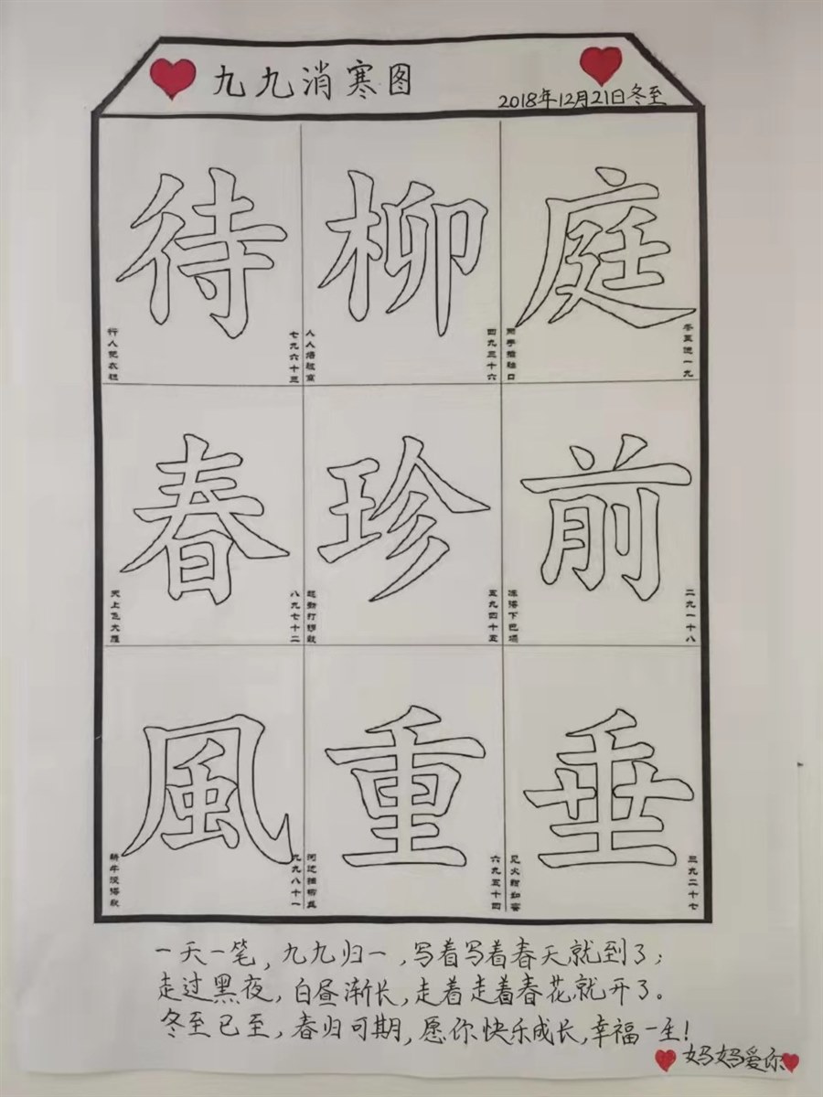 | 前天在家休息,婆婆就说下周二是冬至了,我们要吃饺子。冬至吃饺子的习俗我记忆犹深,这是从记事以来都知道的,大人“冬至不吃饺子耳朵会冻掉”的吓唬,让我对冬至的饺子充满了敬畏感。 随着年龄的增长,我真正读懂了冬至饺子的内涵,医圣张仲景“祛寒娇耳汤”成了千古流传下来的民间传说,饺子成了隆冬之日驱寒温暖的美食,年年岁岁寓意不改。也许是从小的耳濡目染,对于饺子的喜爱是有增无减,喜欢包饺子,喜欢尝试各种不同的花样,喜欢吃饺子,喜欢荤素不一的各种味道。巧的是,我们一家人都喜欢饺子,且口味一致,所以饺子成了常吃的面食。而冬至这天,饺子更是标配美食。 昨晚我开始调制肉馅,依据贝贝的要求,调制的韭菜肉馅。八分瘦肉,葱姜蒜配料,各种料汁加入,又用开水泡了花椒麻椒大料,等水凉后倒入肉馅顺着一个方向搅拌入味,香喷喷的饺子馅就好了。中午下班回家,婆婆擀饺子片我来包,贝贝也来凑热闹,那就热热闹闹包饺子吧。 厨房传来欢声笑语,家常的日子,因为用心加入了色彩,注入情丝,所以普通的饺子透出了美好,也点亮了心情。冬至之日,白昼最短思念最长,有爱陪伴温暖如春;冬至之后,白昼渐长希望常在,追随光亮细水长流。我许下心愿,愿每个日子都能不负时光,怀揣春天,心香自起。 吃饺子啦!围着餐桌,在一片热气腾腾和欢声笑语中,我们美美地享受冬日的饺子,它让我们有足够的暖迎接寒冬的到来。 冬至之日,白天最短,思念最长。我想念远在他乡上学的晶晶,问她是否吃上了饺子,不吃饺子耳朵会冻掉哦。晶晶回复,中午没吃,晚上吃。好吧,长大的妞妞已经会照顾自己,自然也会安顿好日常。 给贝贝准备了九九消寒图,从网上找到了九个九笔画的字,稍加以装饰,一副适合贝贝涂画的消寒图就成了。贝贝一直惦记着呢,数九开始,日涂一笔,涂完九九出,走过寒冬,期盼春暖花开。我在下边郑重写上:一天一笔,九九归一,写着写着春天就到了;走过黑夜,白粥渐长,走着走着春花就开了。冬至已至,春归可期,愿你快乐成长,幸福一生!妈妈爱你。 吃完饺子后,贝贝看着这张九九消寒图,小脸笑眯眯的,她自言自语念着上边的字,念着我写上的那几句话,念着她早已耳熟能详的九九歌。贝贝从幼儿园大班开始在冬至这天涂消寒图,每天晚上睡觉前会自觉涂,从最开始的梅花图,到去年的梅花图和九字图,贝贝养成了今日事今日毕的好习惯。贝贝问我可不可以中午就开始涂,我说还是每天睡觉前涂吧,说明这一天过去了,你也可以安心入眠。贝贝愉快地答应了,小心翼翼收好消寒图。 岁月如水,时光悠悠,经不住似水流年,留不住时光变迁。日子就这样一个节气接着一个,以我们不可阻挡的脚步悄然而至。婆婆说:吃了冬至饭,一天长一线,以后的白天就一点点边长了。似乎每年这一天,婆婆总会重复这句话,她说得轻快,我听得开心。今天的太阳特别暖,坐在阳台上沐浴阳光,心里尽是满足。婆婆说,一九好天,九九好天。这俗语,我相信。 喜欢冬至,因为走过这一节气,白天一点点变长的感觉,它告诉我们走过黑暗,将会迎接更多的光明,这种追寻光明的快乐,让人觉得无比温暖。 冬至到,春可期。在这暖暖的冬日,我写下美好的祝愿,愿所有的美好如约而至!