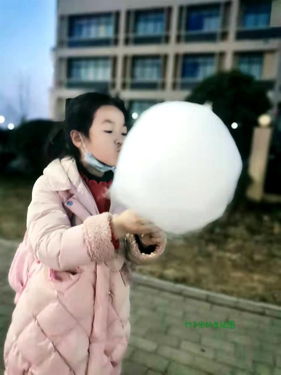 小摊贩总是把车横陈在放学路上,于是小朋友的欲望被一次次挑衅,终于获得首肯一次,喜笑颜开。拿着一个庞大的棉花糖,像举着一面胜利的旗帜。