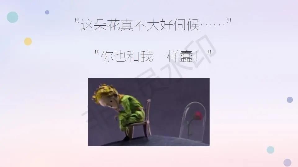 与此同时,被小王子精心呵护的花儿开放了,他们相处了一段时间之后,居然有了如下对话: