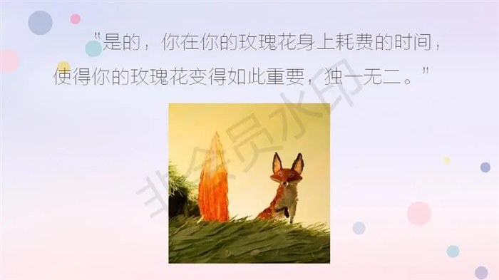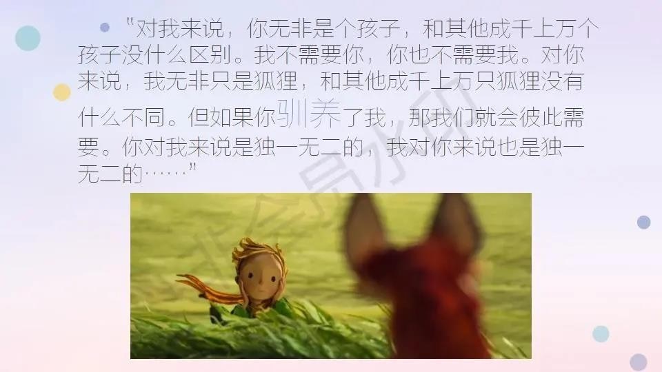 “是的,对我来说,你无非是个孩子,和其他成千上万个孩子没什么区别。我不需要你,你也不需要我。对你来说,我无非只是狐狸,和其他成千上万只狐狸没有什么不同。但如果你驯养了我,那我们就会彼此需要。你对我来说是独一无二的,我对你来说也是独一无二的……”